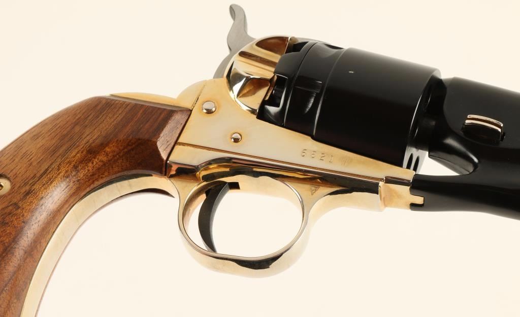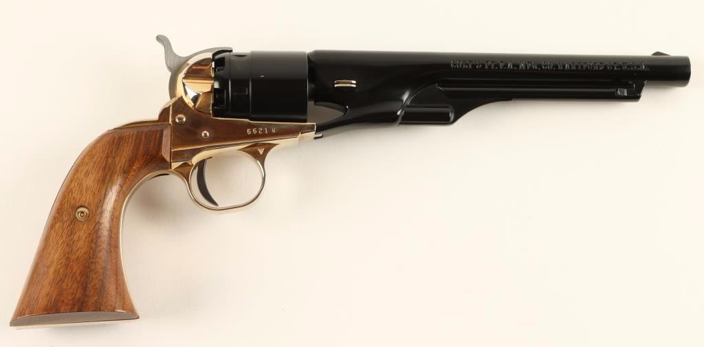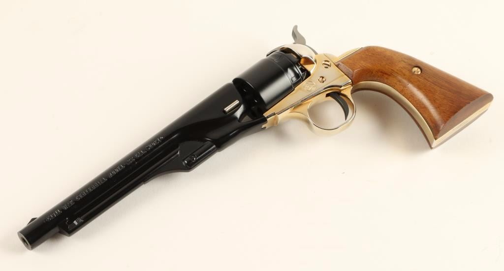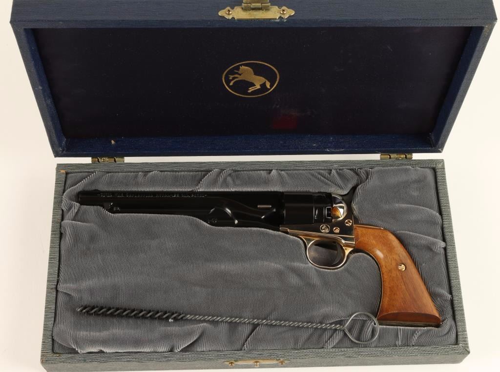 Cased single shot commemorative pistol chambered in .22 short, circa 1961. A scaled down version of the 1860 Army, 1 of only 24,114 produced. Features a black 6" barrel, non-working loading lever, black stationary non-fluted cylinder, brass plated frame, serrated hammer spur, and two piece walnut grips. Includes a Colt fitted presentation with grey velvet lining and cleaning brush. Finish shows a small single loss on cylinder and wear to brass plating on the backstrap and is otherwise perfect. Action is smooth, bore is good, are grips are fine. Condition is near excellent in box. ***C&R Firearm*** ***Modern Firearm***