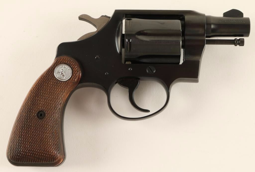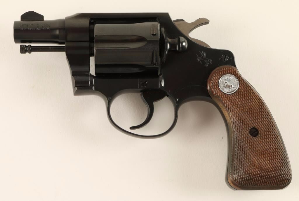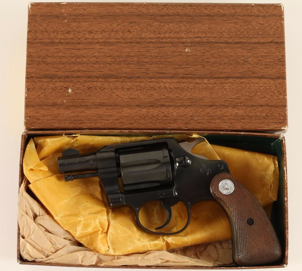 '2nd Issue' Snub nosed double action revolver chambered in .38 Special, circa1964. Features a blued finish, 2" barrel, fixed sights, non-shrouded ejector rod, long fluted six-shot cylinder, serrated trigger & hammer spur, smooth grip frame, and Colt medallion checkered wood grips. Includes a wood grain cardboard box. Finish impeccable with no signs of wear. Action is smooth, bore is pristine, and wood grips are extra fine. Condition is like new in box. ***C&R Firearm*** ***Modern Firearm***