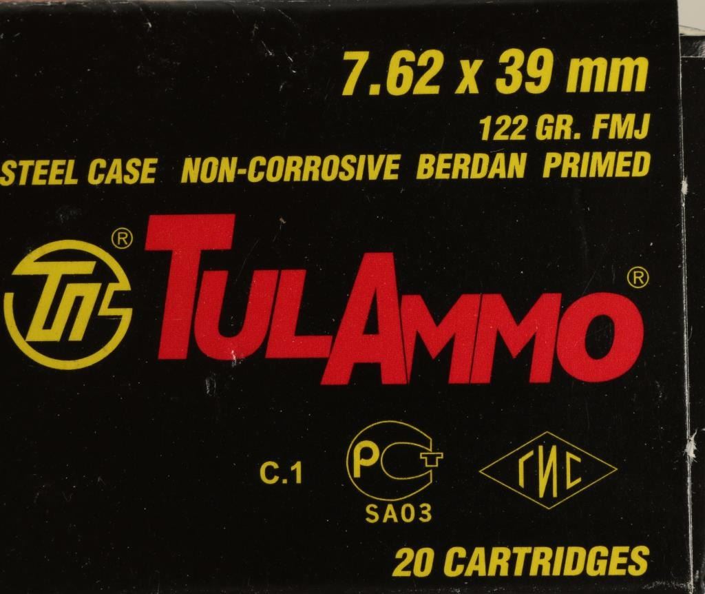 Consisting of thirty 30 round boxes of Tula steel case 122 grain full metal jacket ammunition.