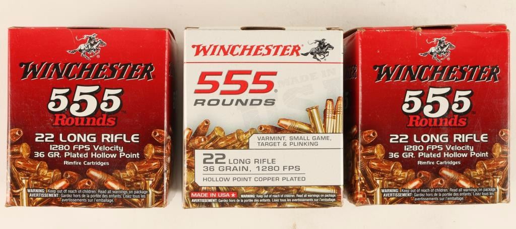 Consisting of three 555 round boxes of Winchester 36 grain copper-plated hollow point ammunition.