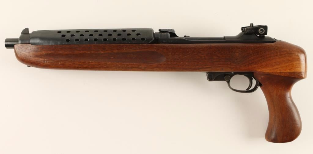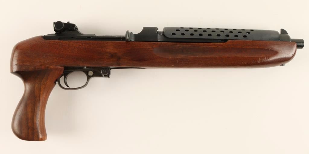 Semi automatic rotating bolt pistol based on the M1 carbine and chambered in .30 Carbine. Features a blued finish, 9" barrel, blade front sight, adjustable rear aperture sight, ventilated metal handguard, round bolt, push button safety, and wood pistol grip stock. Pistol retains 92% blued finish with wear on bolt and scattered light handling wear. Action is strong, bore is excellent, and wood stocks are very good with some blemishes. Condition is very good+. ***Modern Firearm***