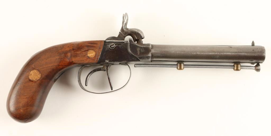 Unsigned side by side double-barrel percussion boot pistol with approximately .44 caliber bores. Features a blued finish, 4.5" barrels, pointed front sight, metal ram rod, exposed hammers, double triggers, and one piece embellished wood grip. Finish retains 35% of bluing with barrels mostly bare metal with areas of light pitting. Action performs well, bores are clear, and wood grip shows fine scratches from storage. Condition is good as antique. ***Antique Firearm***