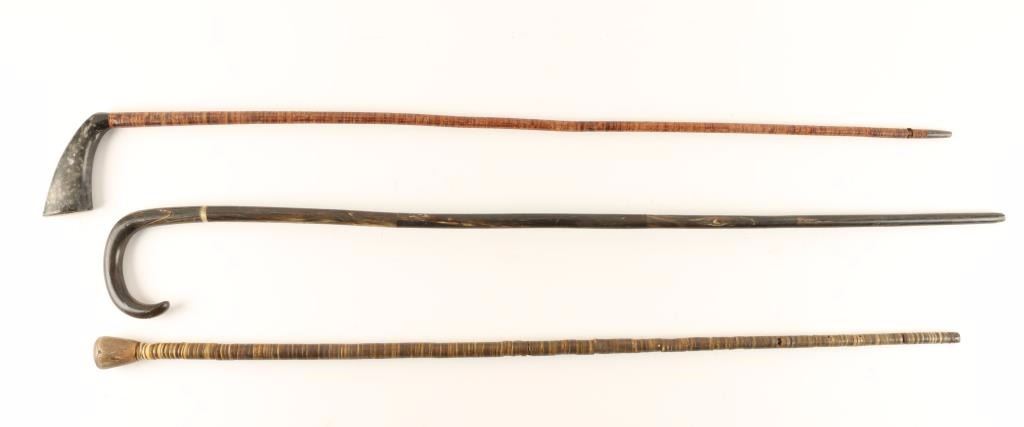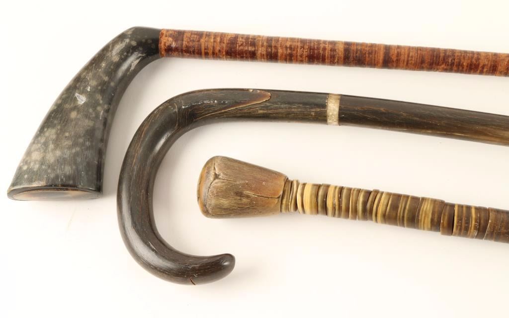 1 Has A Stacked Light Brown Horn Design Measures 34", 1 Has A Dark Horn Color With A Curved Handle-tip Has Loss And Damage Measures 36". 1 Has Stacked Leather Design With A Horn Handle, Minor Losses To Leather Measures 36".