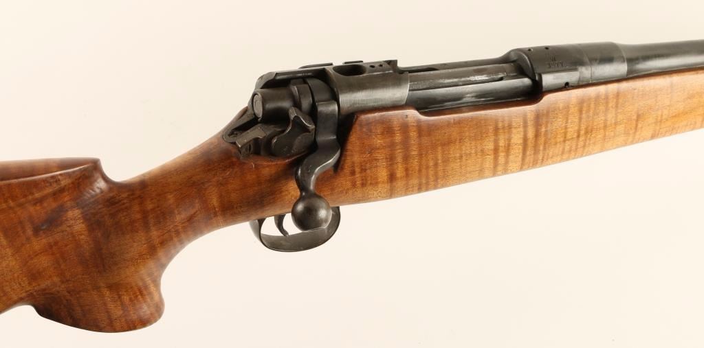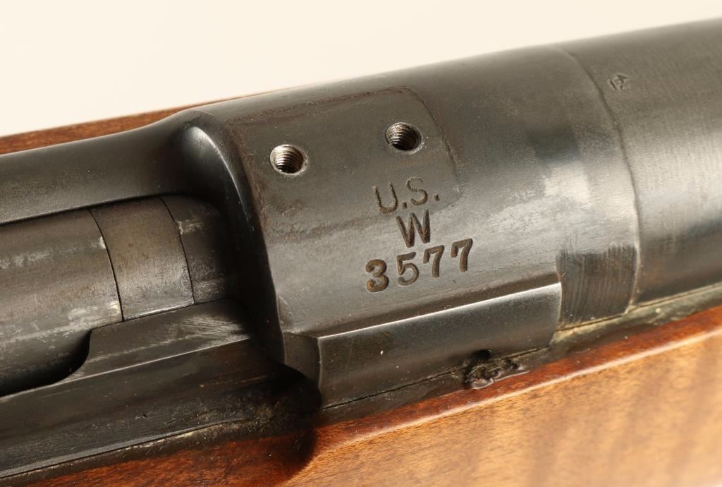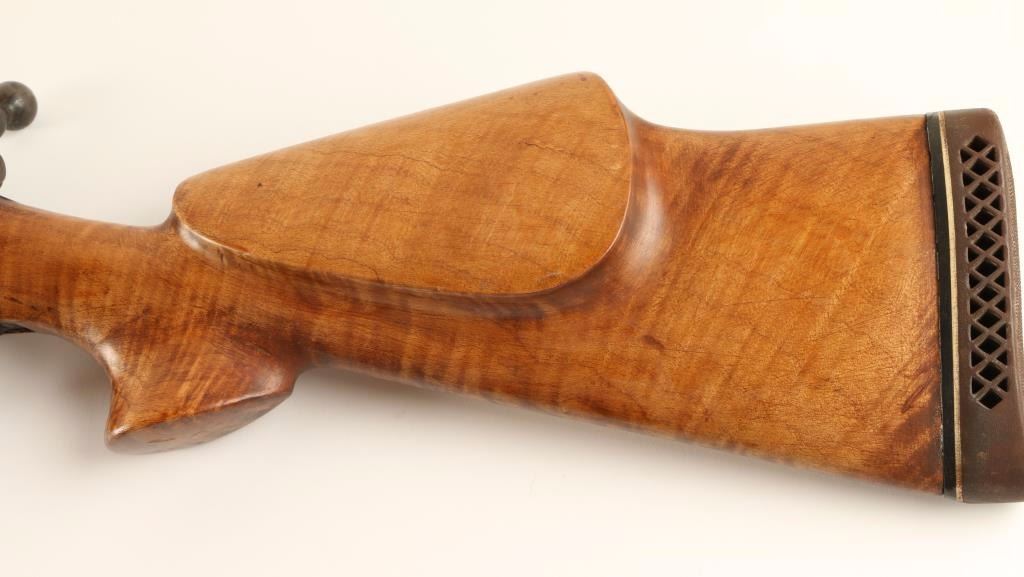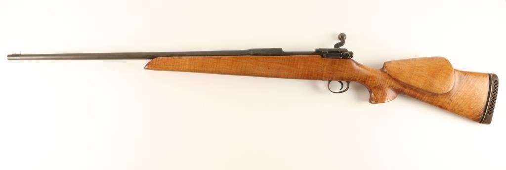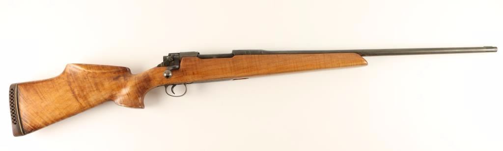 Blued sporterized US military bolt-action rifle with a 26" barrel (stamped "W 7-17"). Has a custom maple stock with Monte Carlo roll-over cheekpiece, hooked pistol grip with palm swell for a right -hander and a recoil pad that is oversized or collapsed to that condition. Receiver has been cleaned of the rear sight ears, drilled and tapped. and is missing the screw for retaining the bolt release. The trigger is still the 2-stage military item. The bore is bright and shiny with sharp rifling. The cock-on-close action works well and safety functions as designed. Bluing is faded with some areas of surface rust spotting. Receiver, barrel and bolt body are marked with "W". Safety and bolt release are marked with "E". Wood condition has fine curly maple figure with moderate scratches and scrapes. Barrel is fully bedded. Condition is good. *Modern Firearm*