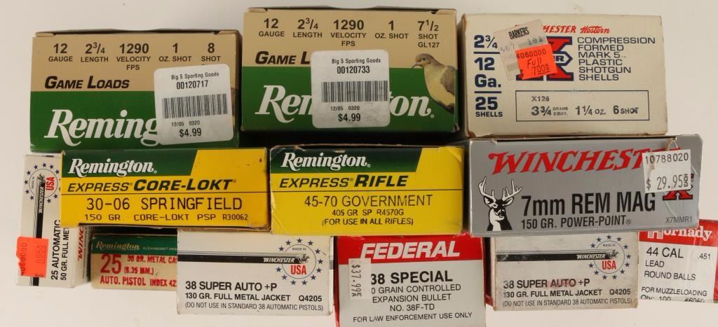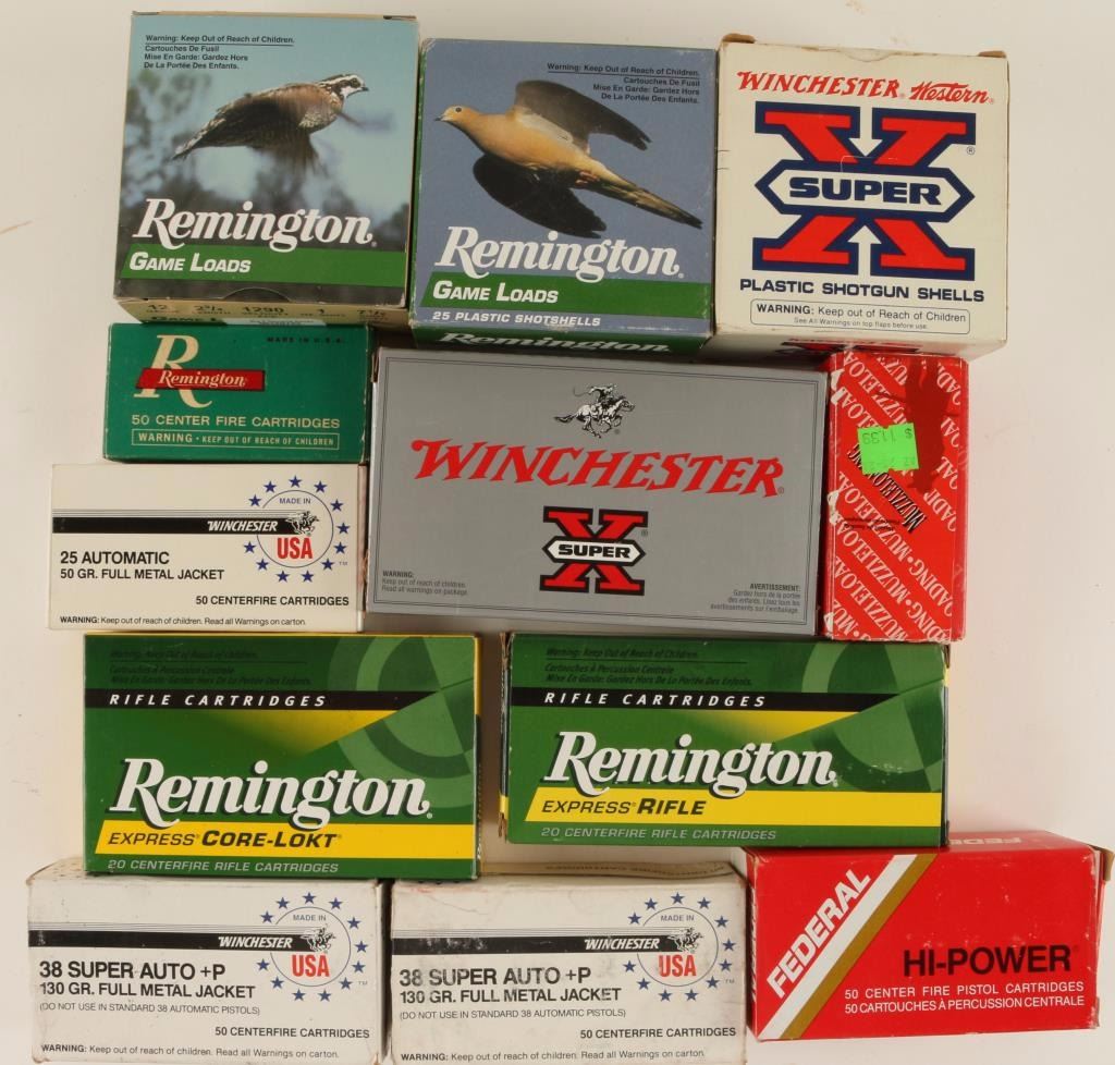 Including; full box of Winchester 12 Ga,. 2 full boxes of Remington 12 Ga. Game Loads, full box of Winchester 7mm Rem Mag, full box of Remington 45-70 Govt., half box of Remington 30-06 Springfield, partial box of 35 Cal. lead round balls, half box of Remington 25 Auto, full box of Winchester 25 Auto, half box Winchester 35 Auto +P, Federal 38 Spl-43 Rds, Winchester 38 Super Auto +P partial box.