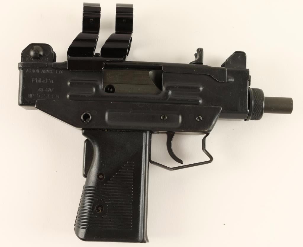 Israeli made stamped steel semi automatic pistol chambered in 9x19mm, and imported by Action Arms. Features a black finish, 4.5" barrel, adjustable three dot sights, safety switch, serrated black synthetic grips, rounded charging handle, grip safety, and Action Arms scope mount with see through rings. Finish shows light handling and storage wear. Action is strong and bore is bright. Condition is near excellent. ***Modern Firearm***