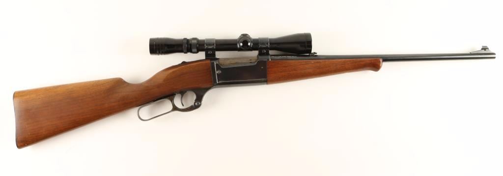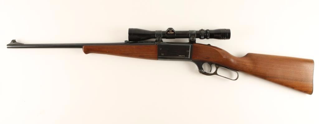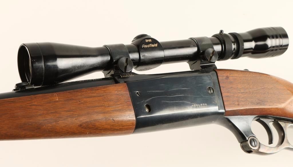Magazine fed lever action repeating rifle chambered in .250-3000 Savage. Features a blued 20" tapered barrel, ramped blade front sight, flip up adjustable rear sight, Redfield 3x-9x scope, blued receiver with round counter, integral rotary magazine, tang safety, cocked indicator, serrated trigger, case hardened lever, schnabel plain walnut forend and straight grip shoulder stock with serrated metal buttplate. Rifle retains approximately 90% original blued finish and dulling case colors on lever. Action is smooth, bore is good, and wood stocks are good with warn varnish. Condition is very good+. ***Modern Firearm***