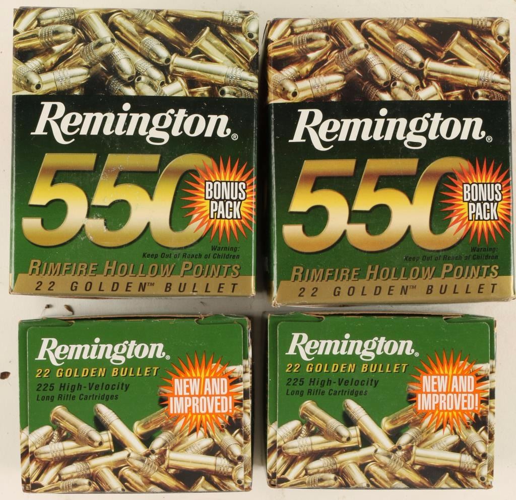 Consisting of two 550 round boxes and two 225 round boxes of Remington Golden Bullet high velocity 36 grain brass-plated hollow point ammunition.