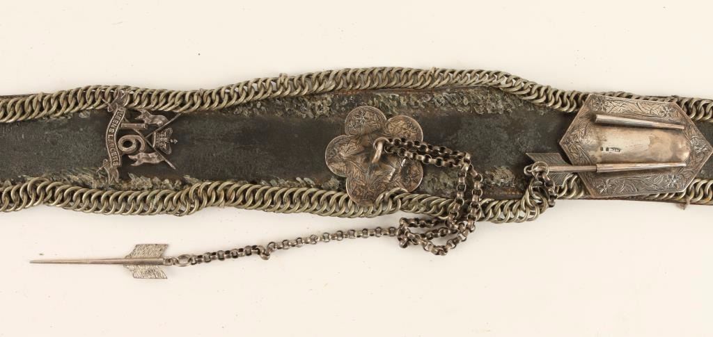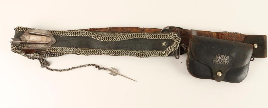 Used by the Queens 16th Royal Lancers. On leather Belt ornamented with Silver chain and hallmarked sterling engraved pieces with pouch with the monogram "AJH". The 16th Queens royal lancers was a Calvary regiment of the British Army. Its lineage is now carried on by the Royal Lancers. Condition is good for its age however it appears the chain may have been glued at one time due to loss of stitching.