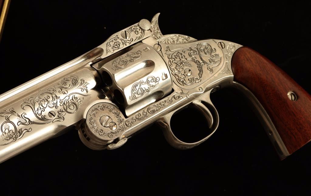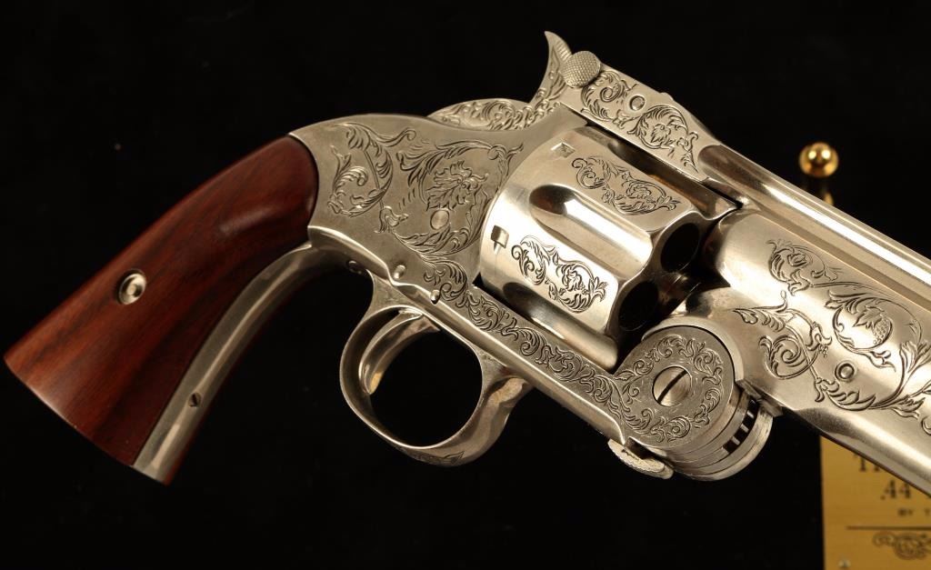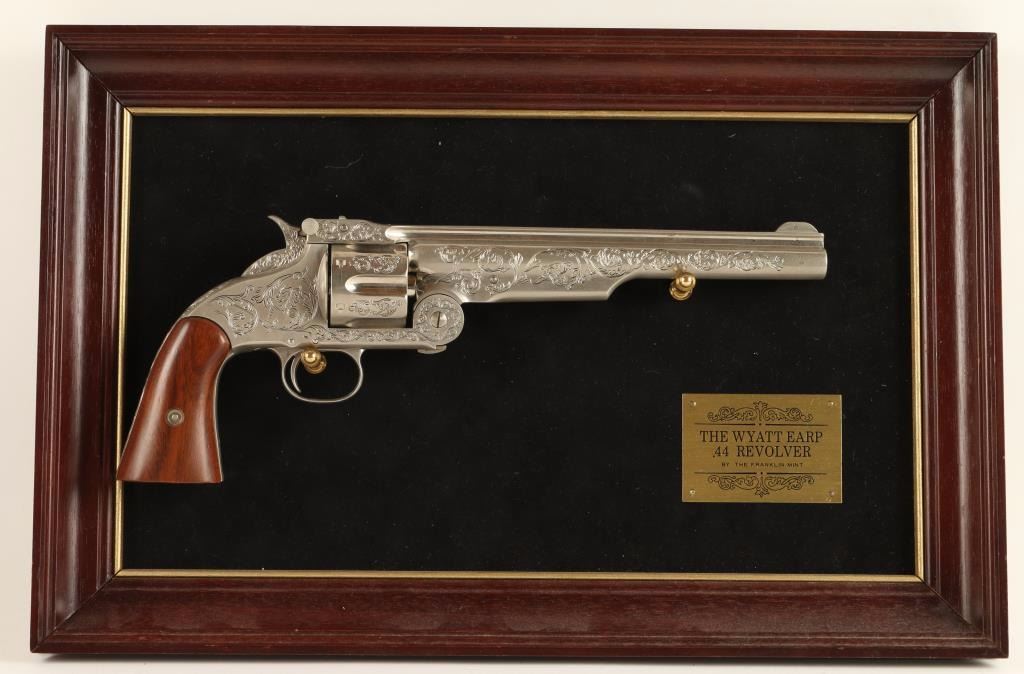 .44 cal. S&W Schofield which he purportedly used in the gunfight at the O.K. Corral. Elaborately engraved Franklin Mint replica polished nickel plate. Thumb up eht catch, "break" the gun open, swing the frame down and the shell-extractor glides out from the cylinder, retracting again when the gun is fully open. All actions work, but it will not fire real ammo. Length 13.5", weight 2.5 lbs. Comes with display frame with black velvet backing, brass plaque reads "The Wyatt Earp .44 Revolver by The Franklin Mint". Measures 18"x12". Great display piece!