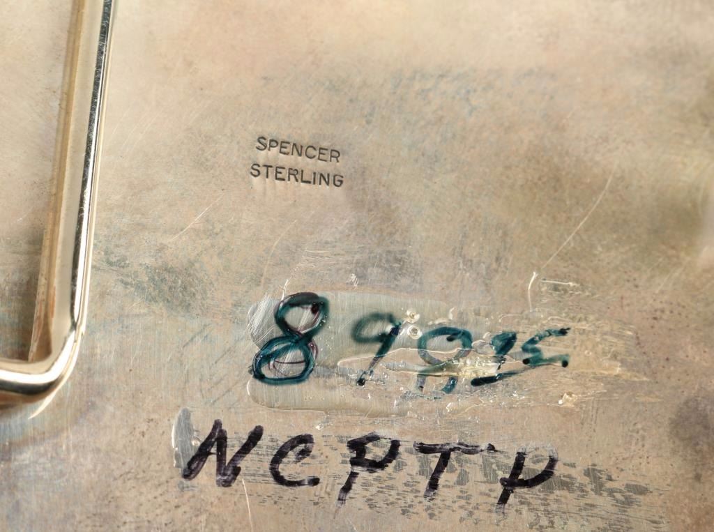 Large rectangle of sterling silver with nicely molded border frames 22 pieces of turquoise stones. Beautiful light blue with interesting matrices. Marked "Spencer" and "Sterling" on back. Measures 4"x3".