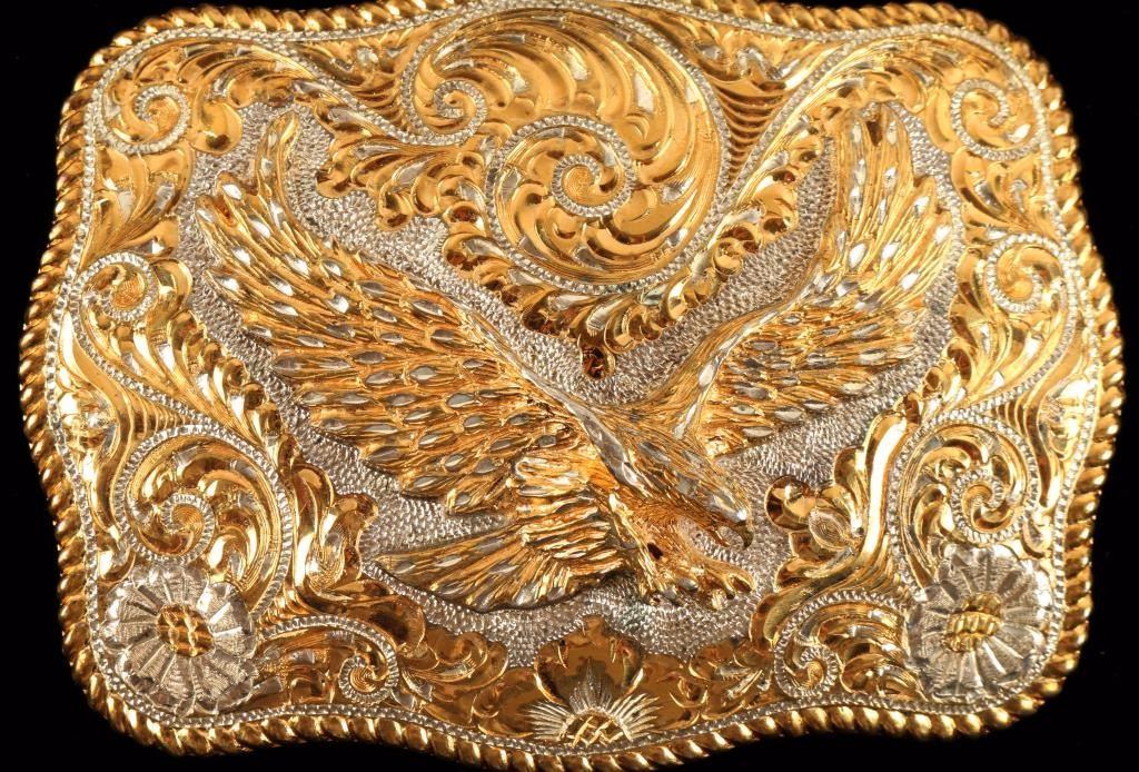 Large gold eagle spreads his wings across the center of an ornately scrolled and floral design buckle. Back reads "Crumrine Mfg. 1989, Reno, NV USA, 22K Gold on Sterling". Measures 4 1/2"x3 1/4".