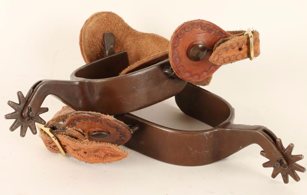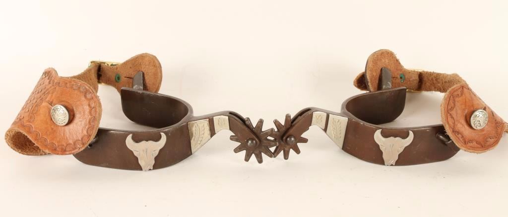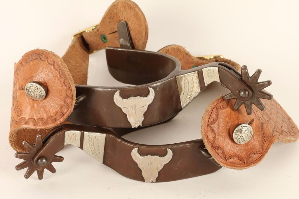 Tan basketweave stamped straps. Copper metal with silver overlay buffalo skull and etched bands. Shows some use.