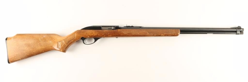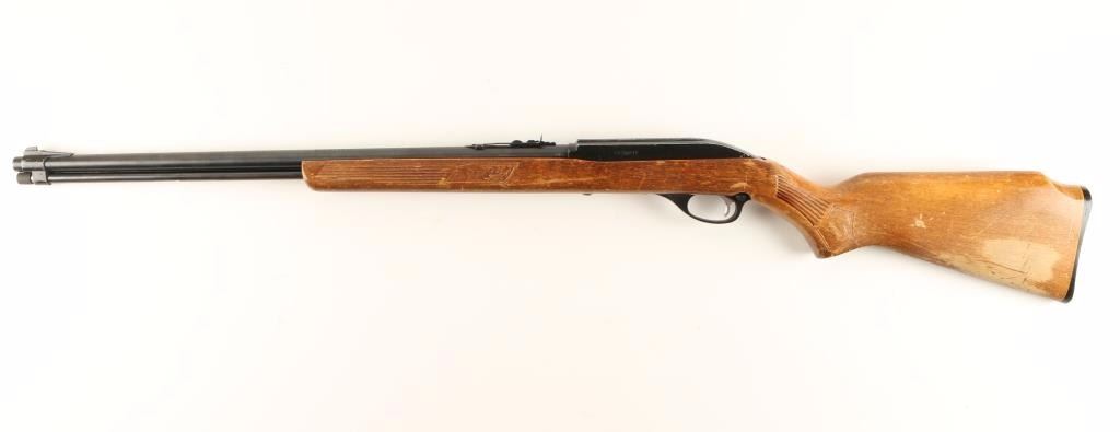 Blued , black alloy, black plastic semi-automatic tube magazine fed rifle with a 22" barrel, adjustable rear sight, and Monte Carlo wood stock. Bluing has slight fading with a little rust freckling and edge wear. Bore is pristine. Action works well. Alloy front sight, trigger guard and receiver have lots of edge wear and a few scuffs. Wood stock has pressed decorative panels and shows lots of wear through the stain as well as dings, rubs and scratches. The trigger guard is of the early narrow tang variety. The butt plate has dings and erosion wear. Condition is fair. *Modern Firearm*
