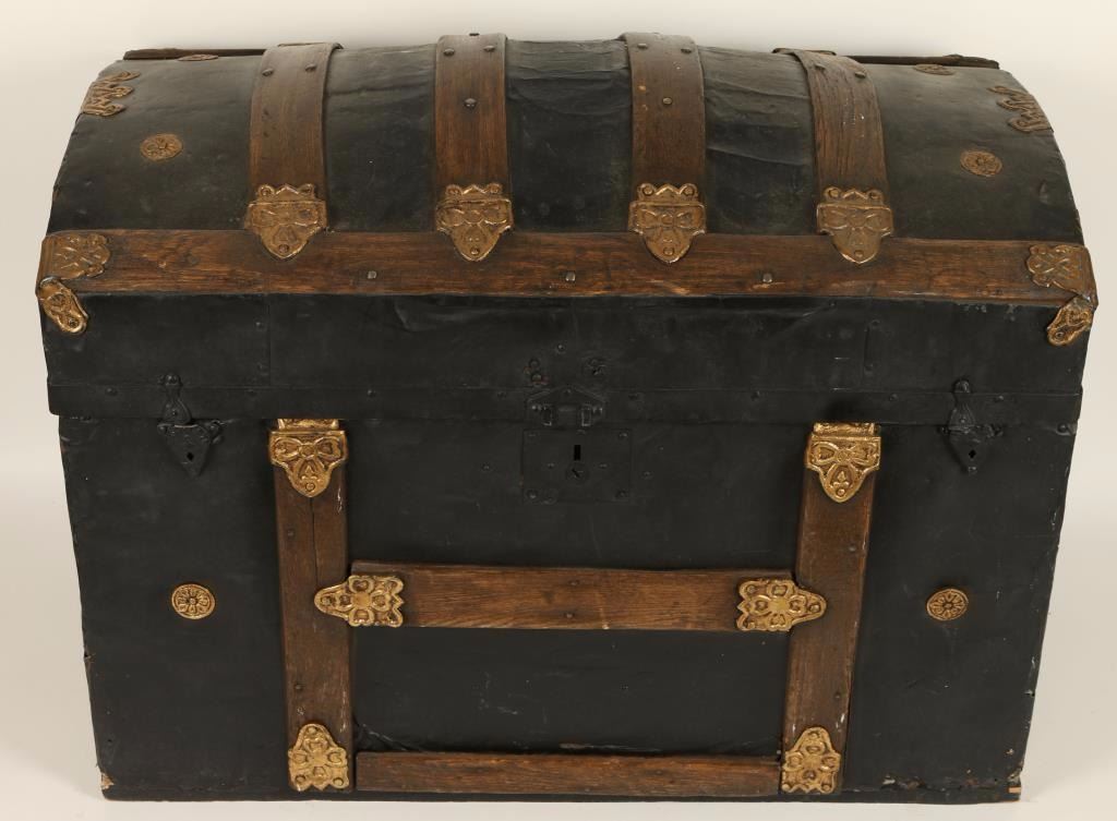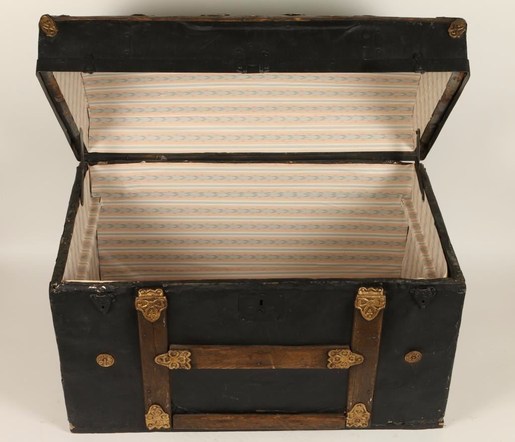 Black dome top trunk. Metal and wood with brass hardware. Appears to have been refinished. Leather handles have been replaced and clasps at the front of the trunk are missing. Inside has been lined with contact paper. Shows age and use. Measures 30.5"x23"x18". Great for display!