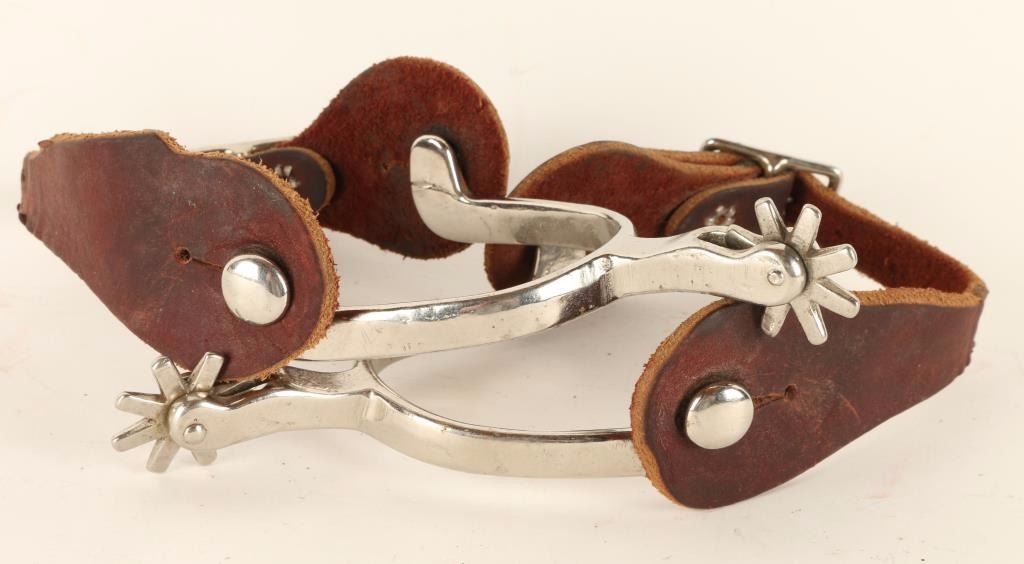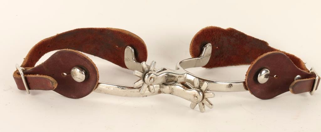 Smooth brown leather straps. Plain arms with small rowel. Unmarked, show some rust and scratches.