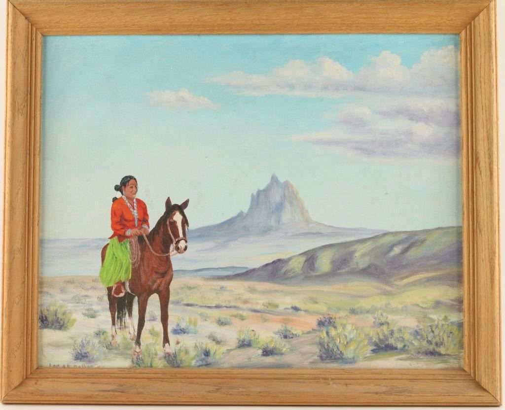 Depicting native woman on horseback in desert landscape by Logan Dallas. Image measures 18"x24" in wood frame.