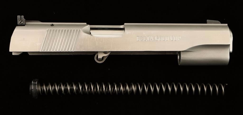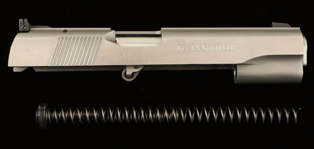 Complete stainless steel slide with correct 10mm barrel. Features partridge front sight, adjustable window rear sight and serrated top rib. Finish shows moderate handling wear with light scratches mostly toward edges. The "Delta Gold Cup" stamp on left side of slide is faint towards top of marking. Bore is excellent. Condition is very good.