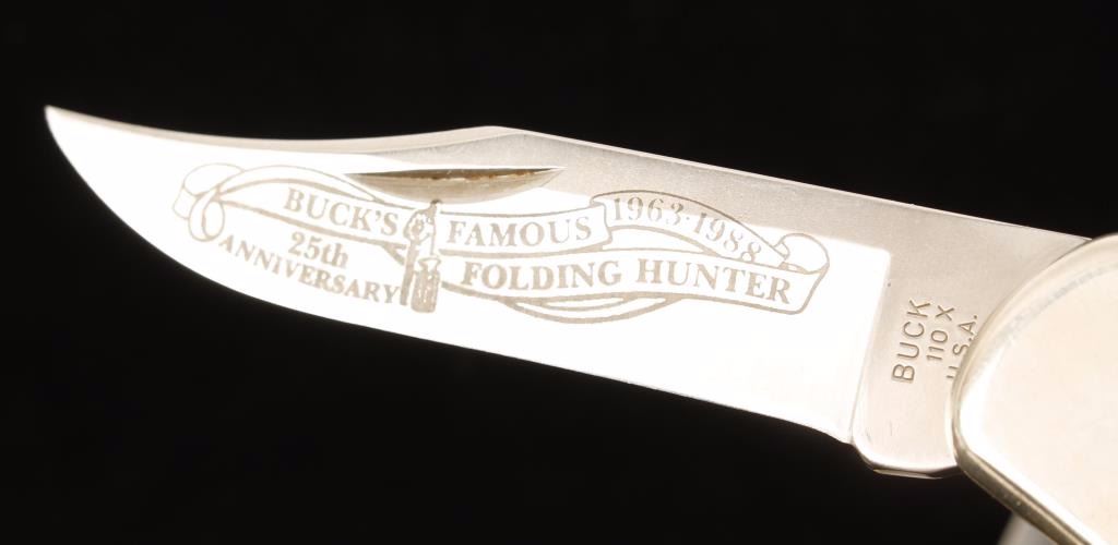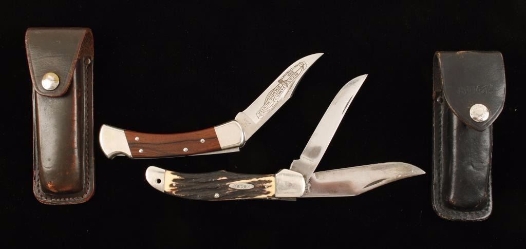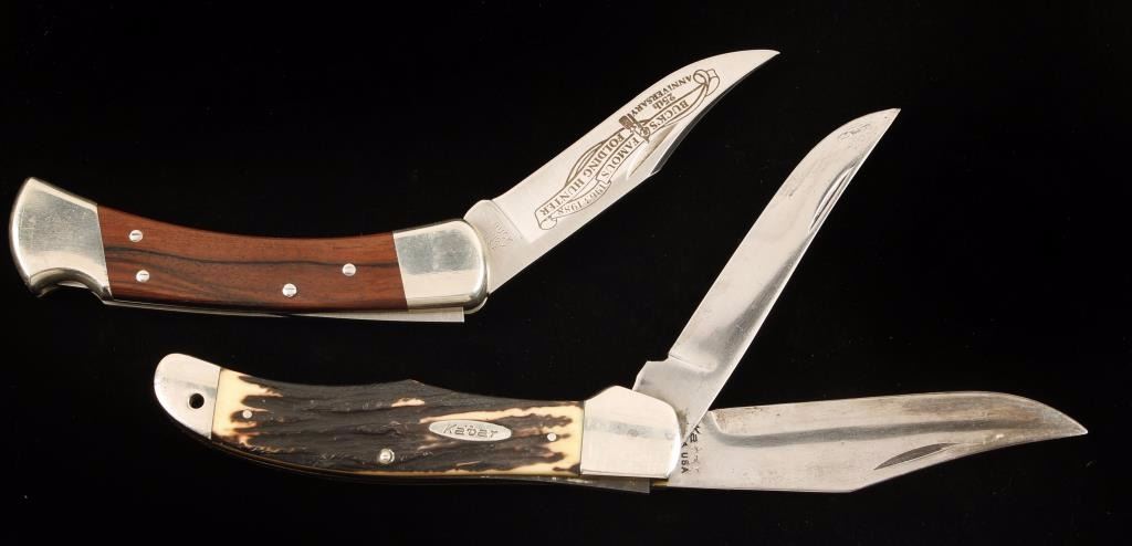 (1) Kabar U84 Folding Knife with antler handle and sheath. (1) Buck 25th Anniversary Folding Hunter 110X wood handle with sheath.