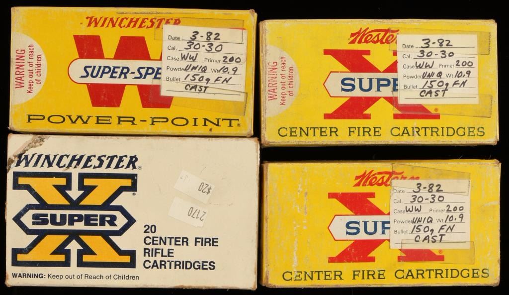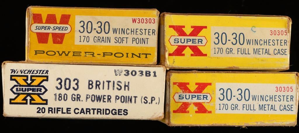 Consisting of 60 rounds or reloaded Western Super-X .30-30 brass with "150 grain cast flat nose", and one 20 round box of Winchester Super-X .303 British 180 grain power point ammunition.