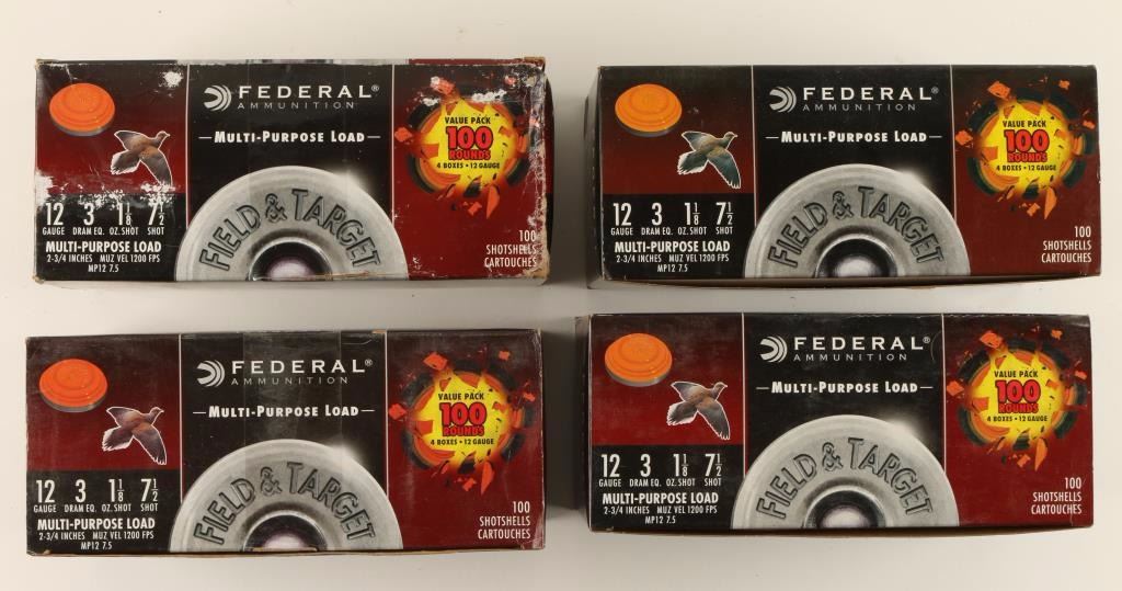Consisting of four 100 round boxes of Federal Field & Target 2 3/4" 1 1/8 ounce 7 1/2 shot, shells.