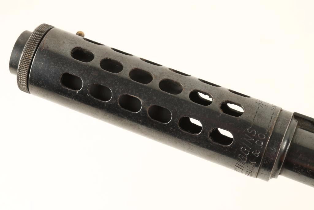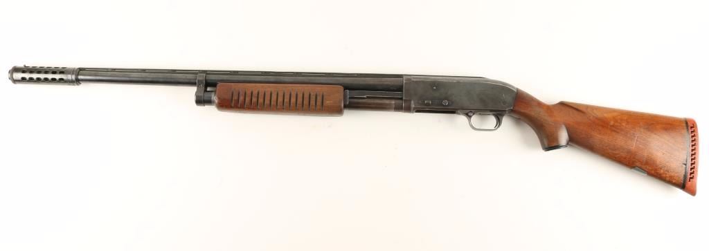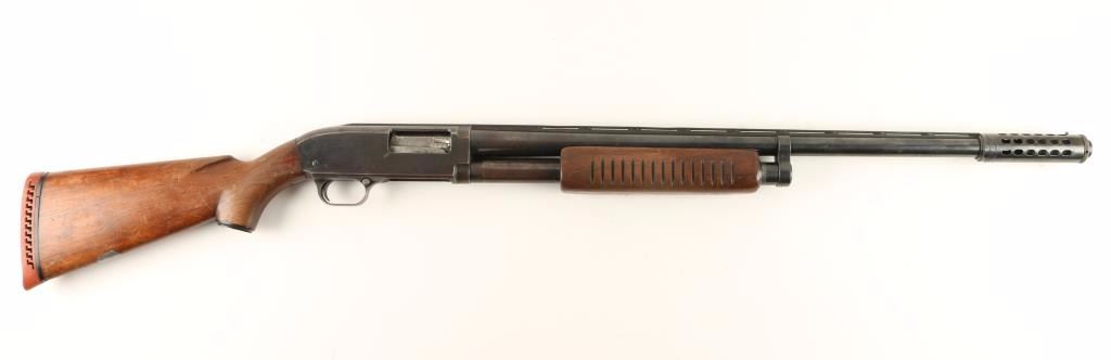 Blued, pump-action shotgun with a 26-7/8" barrel (including the "Power-Pac" compensator), elevated rib (with mid point bead and front bead), jewelled bolt and carrier, magazine cut-off, wood furniture and original recoil pad. Bluing has some edge wear, surface rust freckling, and wear from pump action. There are also a few scratches. Alloy trigger guard has been worn to bare metal. Bore is shiny with a few tiny ripples. There are a few depressions in the elevated rib between pillars. Action works well. Wood has rubs, scratches and dings with a silver-colored monogram shield inlaid in the stock. The recoil pad is in fair shape. Condition is fair to good. *Modern Firearm*