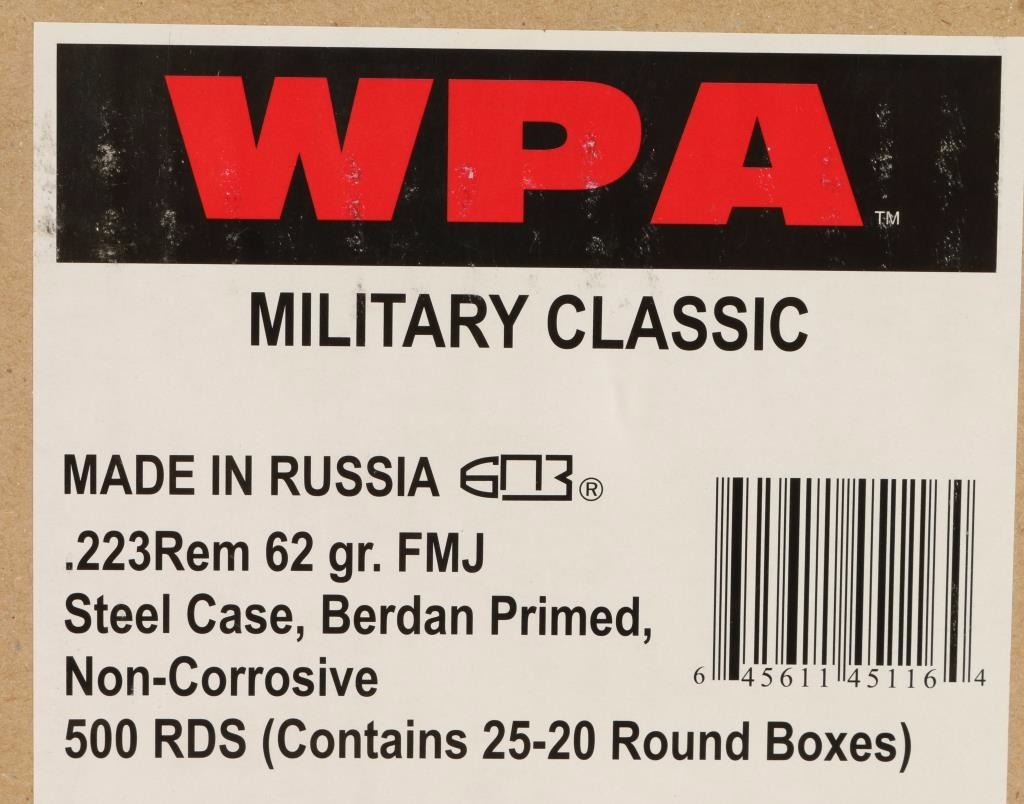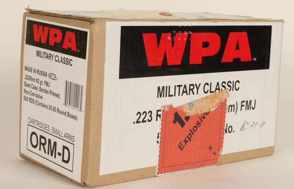 Consisting of twenty-five 20 round boxes of Wolf WPA Military Classic steel cased 62 grain full metal jacket ammunition.