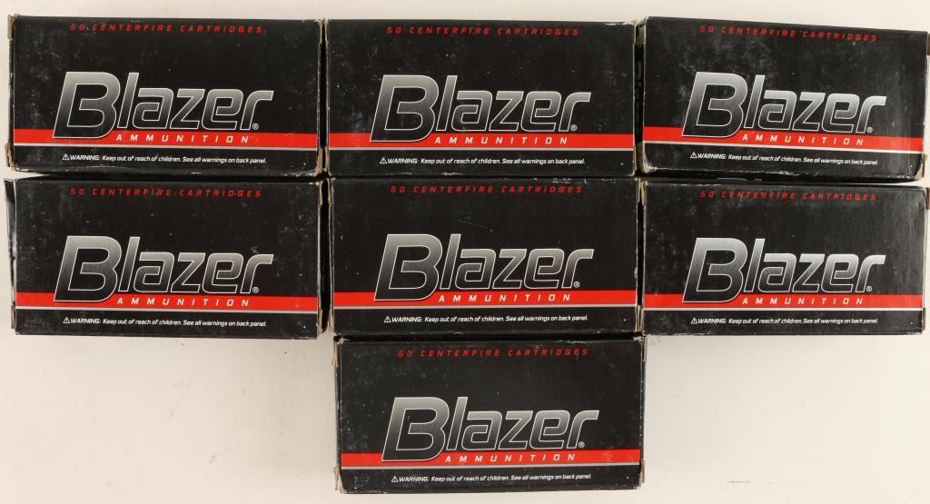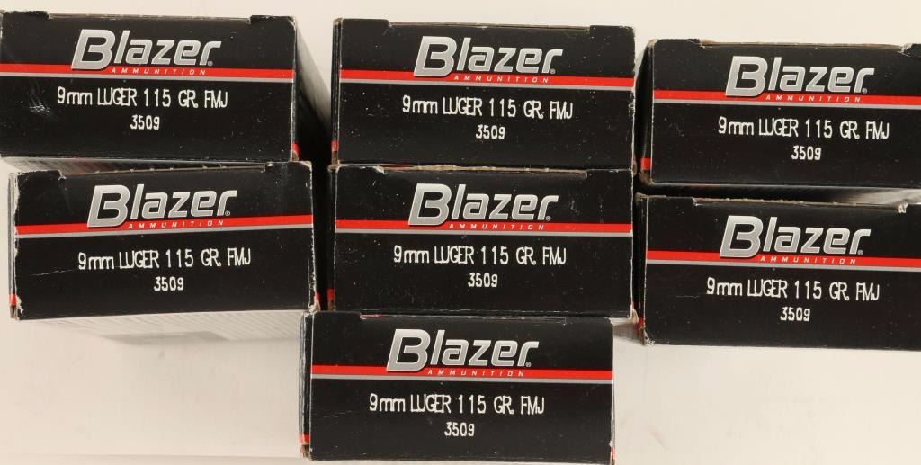 Consisting of seven 50 round boxes of CCI Blazer aluminum case 115 grain full metal jacket ammunition.