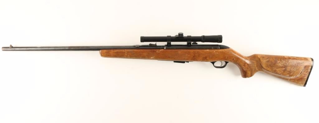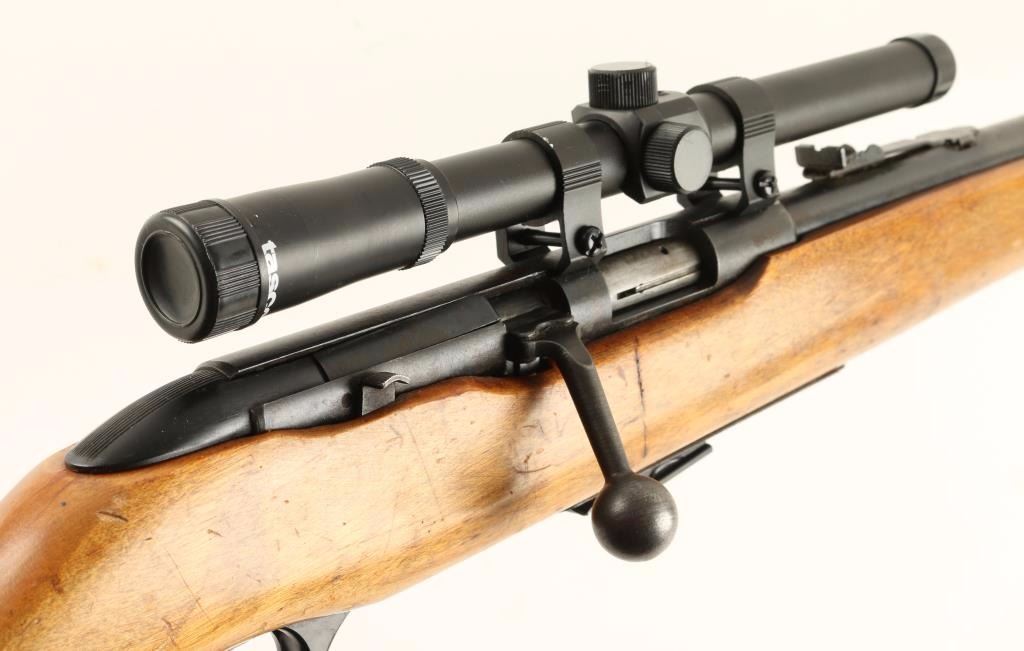 Blued, black alloy, black plastic, bolt-action, detachable box magazine fed rifle with a 24" barrel, one magazine, elevation adjustable rear sight, Tasco RF4x15 scope and wood stock with black plastic butt plate. The bluing has edge wear rust freckling and scratches. The front sight is a homemade replacement. The plastic trigger guard is cracked on one side and has scuffs and rubs. The plastic butt plate has a large chip out of the toe as well as scratches and dings. The scope has end caps and duplex reticle. The wood stock has scratches, rubs, dents, a hole and dings but no cracks or chips although the toe of the butt is worn down. Condition is poor to fair. *Modern Firearm*