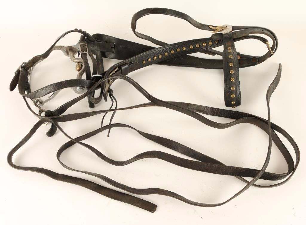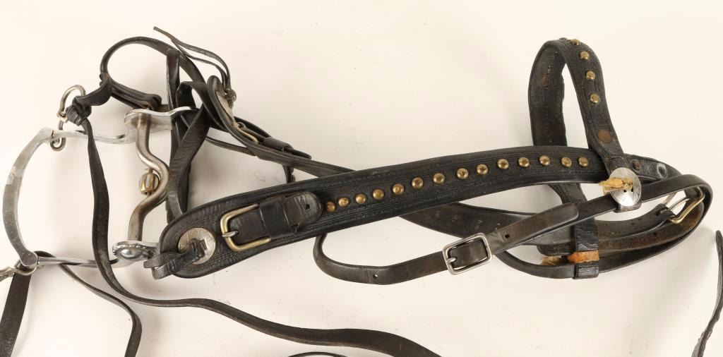 Smooth black leather with brass tacks and silver metal conchos. Nickel plated bit with floral design medallions. Shows use and age.