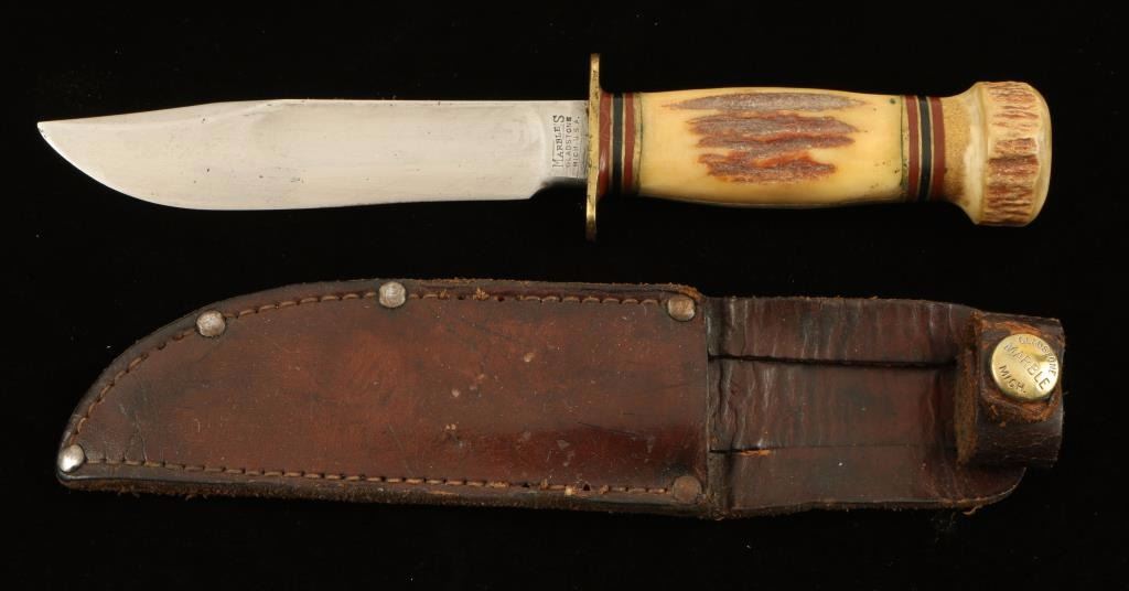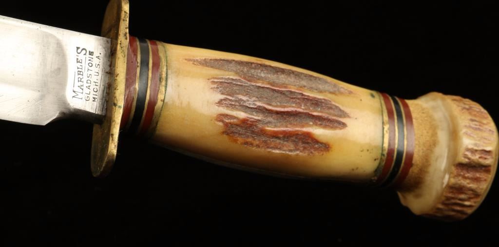 Features a Gladstone marked 5" clip-point blade, brass hilt and stag handle. Includes a Marble brown leather belt loop sheath. Overall length is 9". Condition is very good.