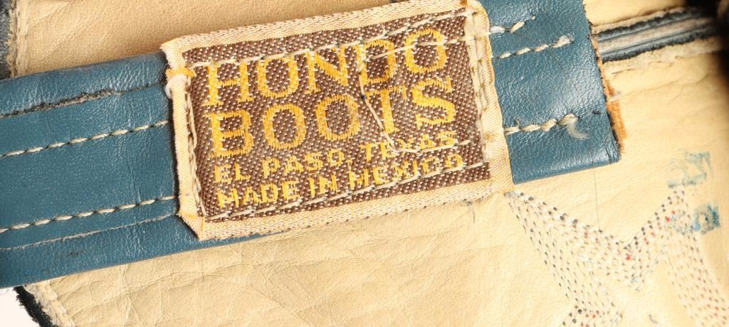 Blue Hondo boots with 14" shaft that has orange and yellow leaf pattern stitched on them. Size 6B, fair condition, damage to ends of toe and show wear.