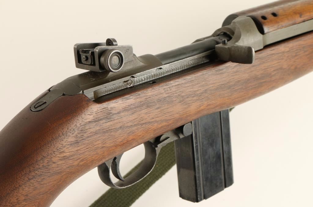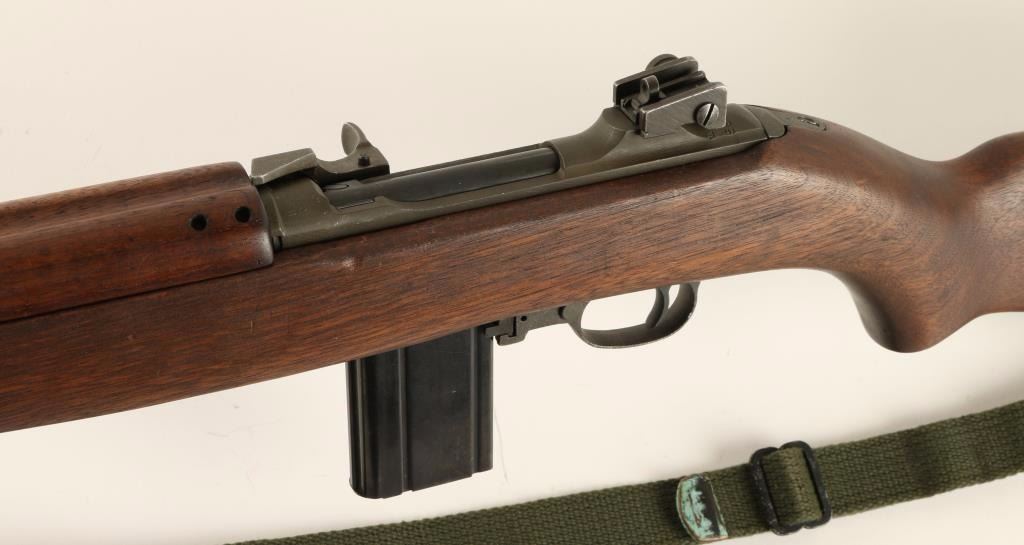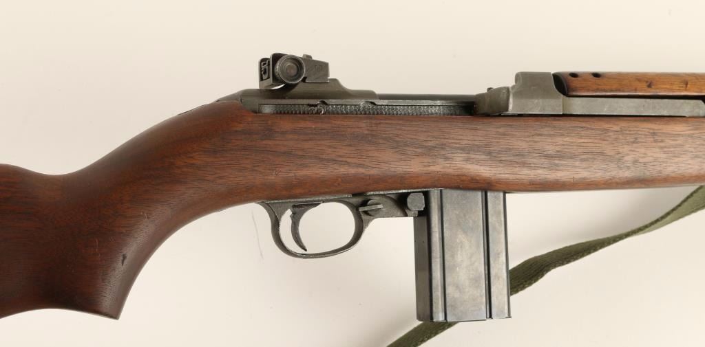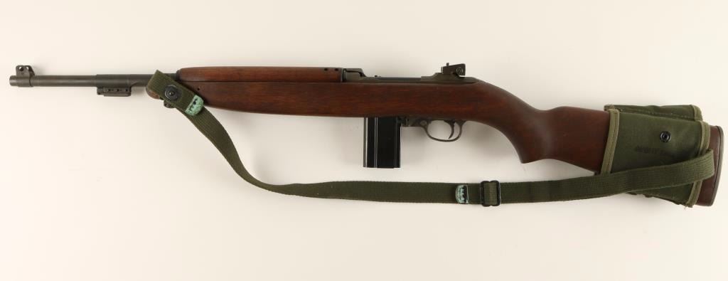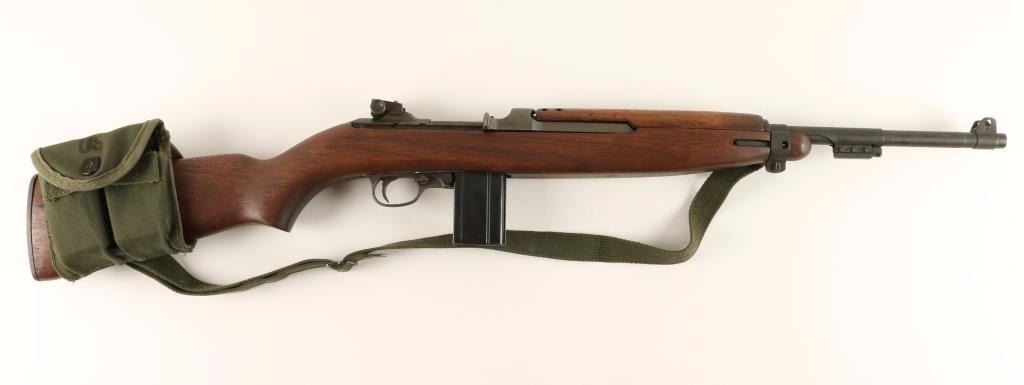 Rebuilt U.S. Military contracted semi-automatic rifle chambered in .30 Carbine, circa 1944. Features a parkerized finish, 18" barrel stamped "W", winged front sight, adjustable rear aperture sight, wide barrel band with sling swivel, bayonet lug, low-wood hand guard with narrow groove, oval cut oiler slot, rotary style safety, smooth trigger, round bolt, and wood shoulder stock with no visible markings. Includes oiler, magazine pouch with two 15 round magazines, and post WWII style canvas sling. Rifle retains 96% parkerized finish with light handling wear. Action is smooth, bore is excellent, and wood stock is fine. Condition is excellent as rebuilt. ***C&R Firearm*** ***Modern Firearm***