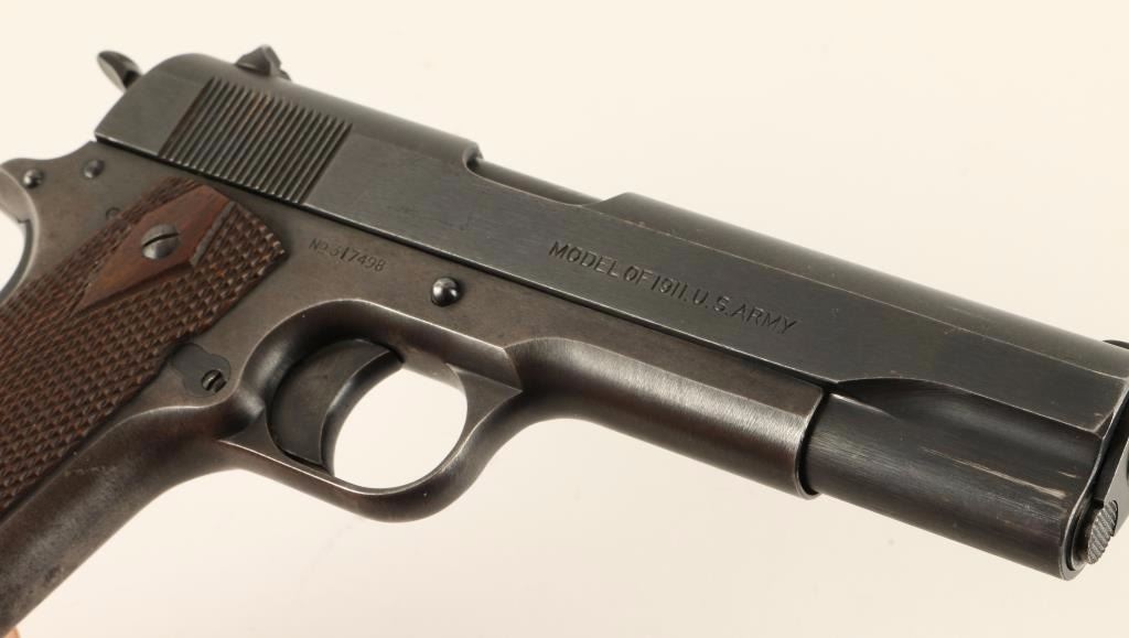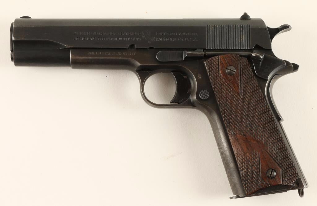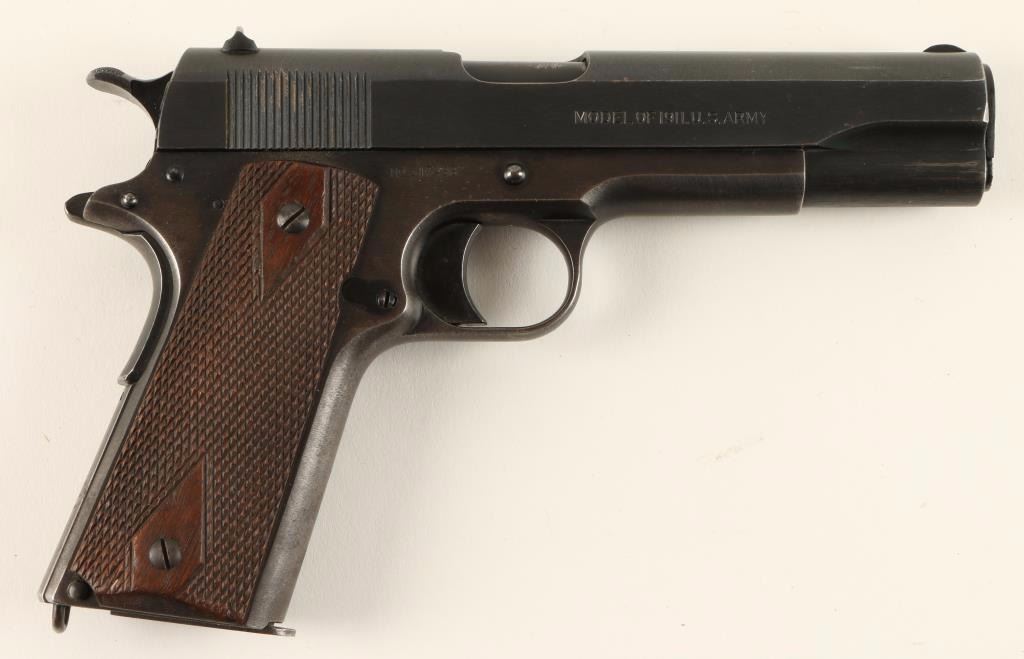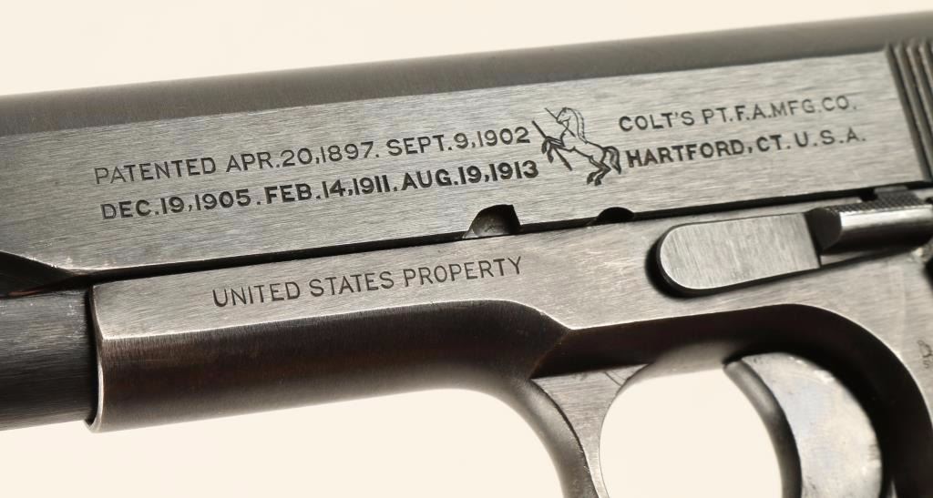 U.S. military contracted semi automatic pistol chambered in .45 Automatic Colt Pistol, circa 1918. Features a dark blued finish, 5" barrel marked "P" & "H", low profile blade front sight, fixed rear sight, serrated slide marked "Model of 1911 U.S. Army", thumb safety switch, beavertail grip safety, push button magazine release, later 7 round magazine, "United States Property" & Eagle over "S14" acceptance marked frame, smooth main spring housing with lanyard loop, smooth trigger, checkered hammer spur and double diamond checkered two piece wood grips. Slide retains 87% and frame retains 65% original dark bluing with the remainder turned patina. Action is strong, bore is excellent, markings are crisp, and wood grips are very good with heavily worn spot on left grip panel. Condition is near excellent as vintage. ***C&R Firearm*** ***Modern Firearm***