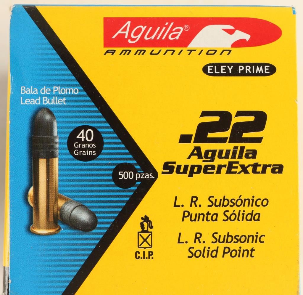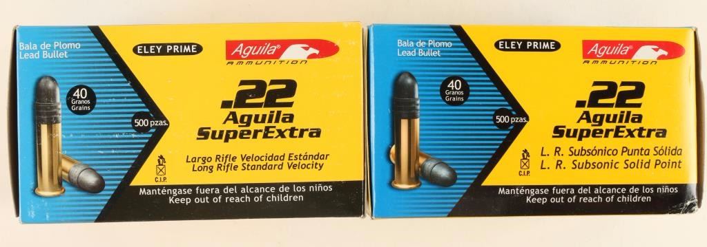 Consisting of two 500 round cases of Aguila SuperExtra 40 grain Eley primed solid point ammunition.