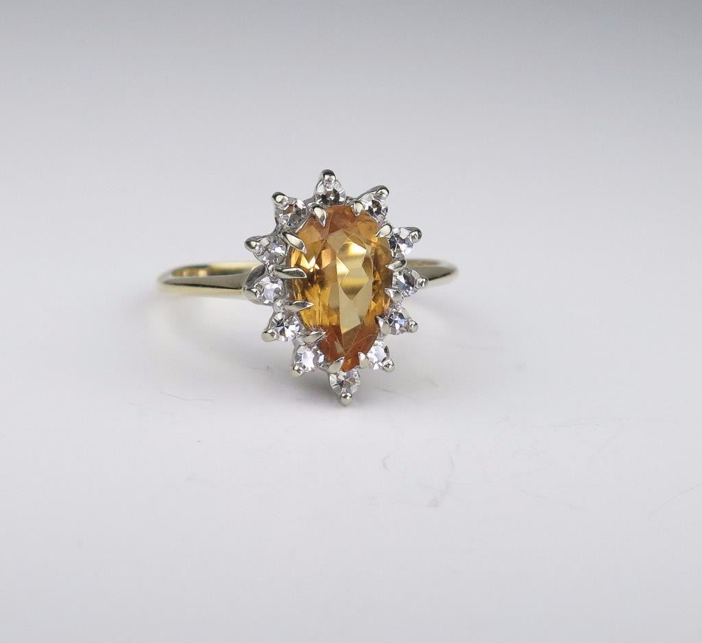 Featuring an approx. 3.00 carat pear shaped golden color imperial topaz with 12 round diamonds weighing approx. 0.50 carats with F-G colors and VVS/VS clarity set in 14 karat two-tone gold. A nice item.