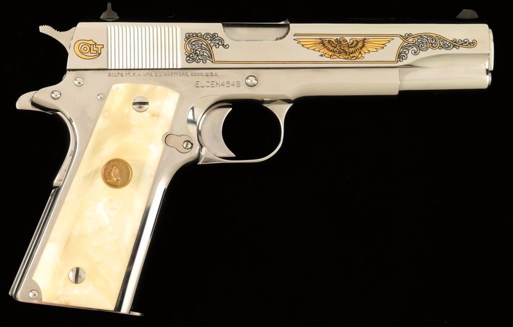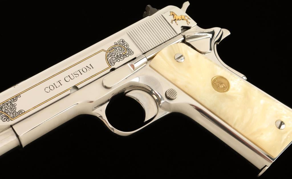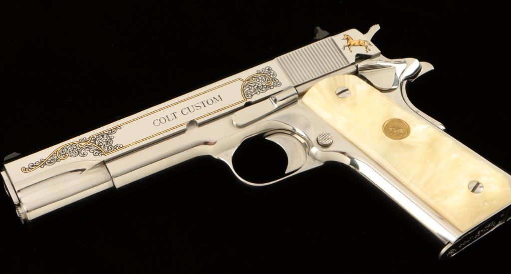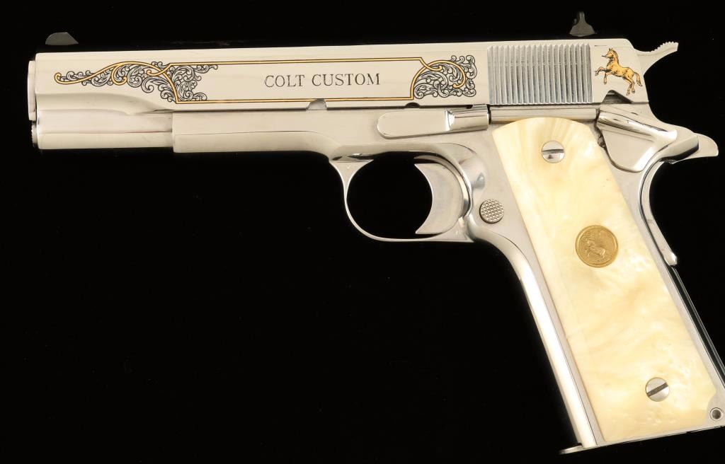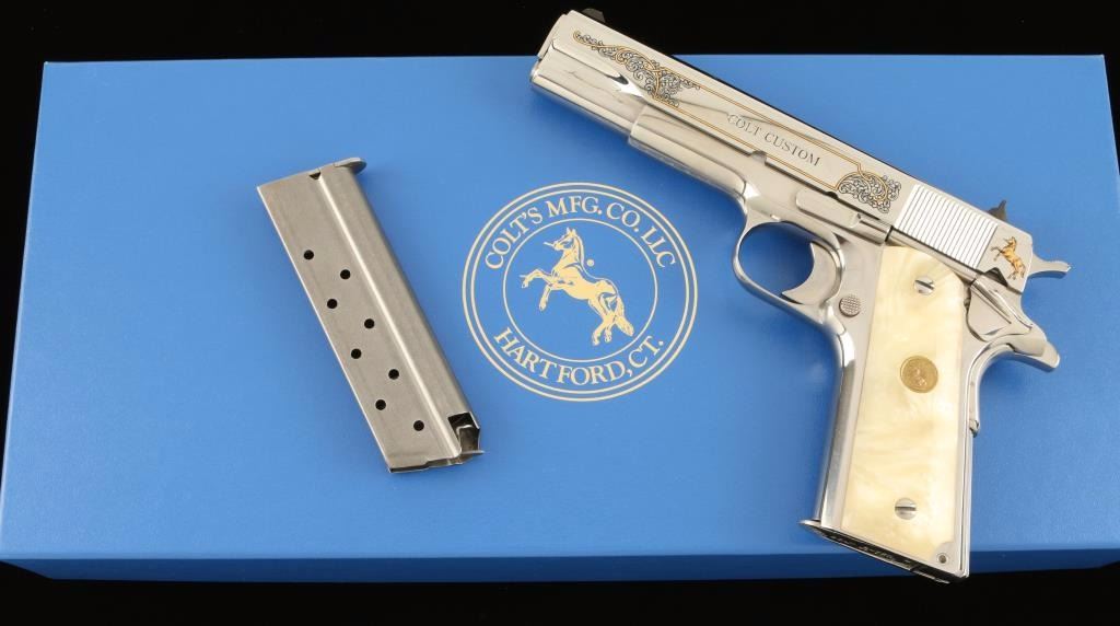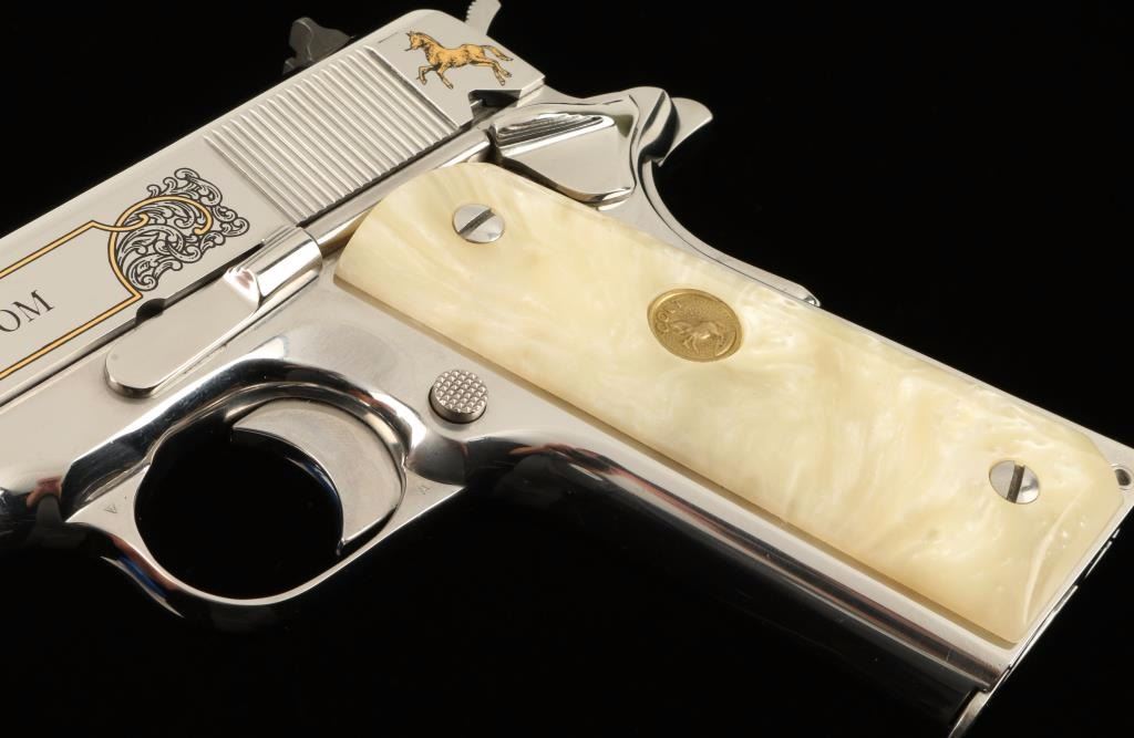 'Custom' Engraved semi-automatic 1911-A1 style pistol chambered in .38 Super. Features a high-polished bright stainless steel finish with gold & black accents, 5" barrel, scroll engraved slide with Rampant Colt & eagle motif, three dot sights, serrated mainspring housing, beavertail grip safety, thumb safety switch, push button magazine release, 9 round magazine, serrated hammer spur, and two piece Colt medallion faux mother of pear grips. Includes original blue box, sleeve, lock, documents, and extra magazine. Finish show little to no wear. Action is solid, bore shows residue, and grips are fine. Condition is excellent in box. ***Modern Firearm***