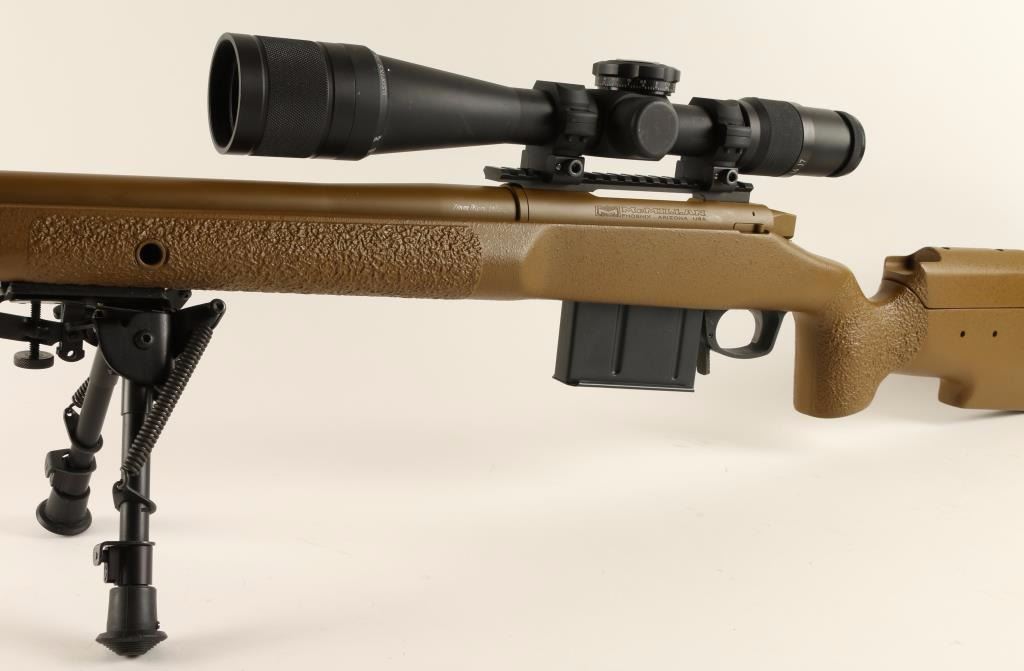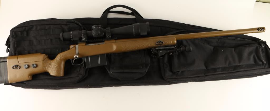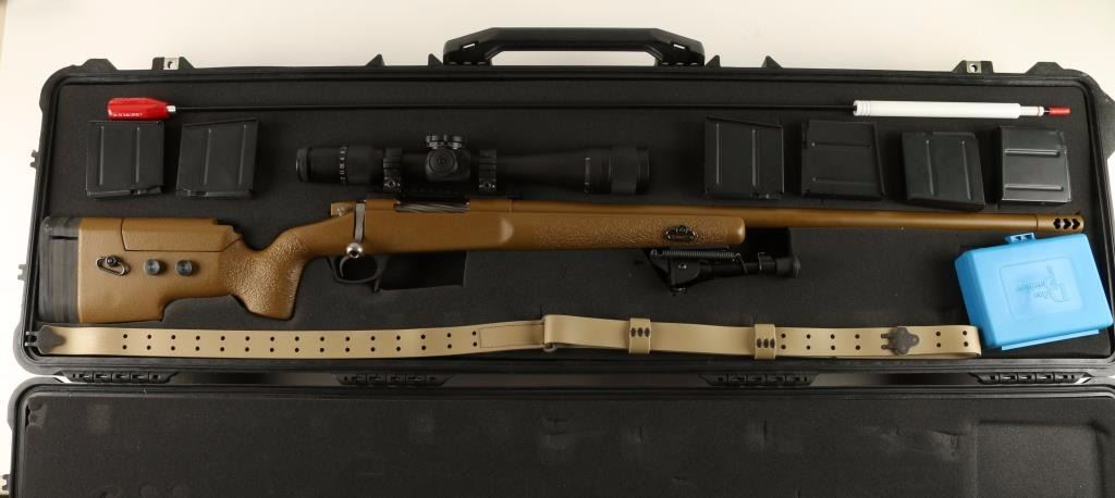Extremely high quality custom built long range precision rifle chambered in 7mm Remington Magnum. Features an od green finish, 26” match grade barrel with muzzle break, no sights, U.S. Optics SN-3 3.2x17x variable power scope, adjustable bi-pod, sling swivels, thumb safety switch, 5 round detachable magazine, and Tactical fiberglass stock with adjustable cheek piece. Includes a Pelican hard case with fitted foam insert, McMillian Tactical drag bag with shoulder straps, sling, cleaning kit, and five extra magazines. Finish shows little to no wear. Action is smooth and bore is pristine. Replacement cost would easily reach $8,500+. Condition is like new in case. ***Modern Firearm***