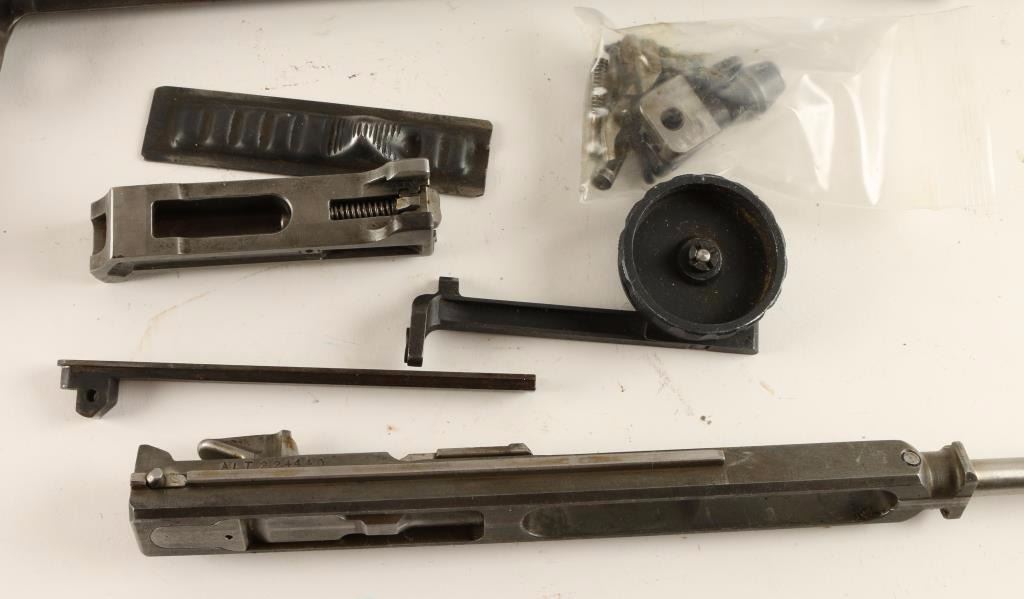 Including: Lower receiver, three position selector, wood pistol grip & shoulder stock, heavy barrel with flash hider, front sight, & handle, extension & pistol, magazine, bipod, bolt, drum, cover, and many small internal parts.