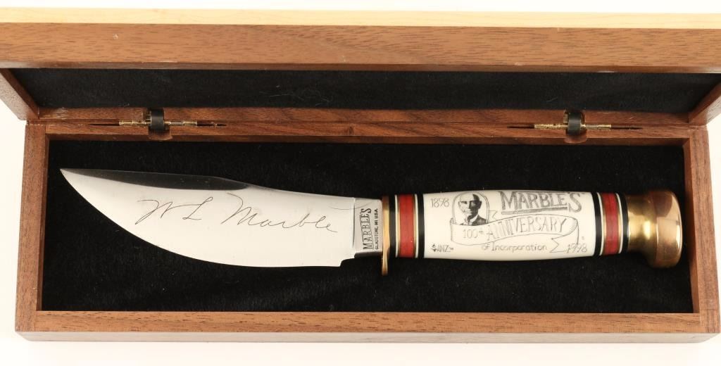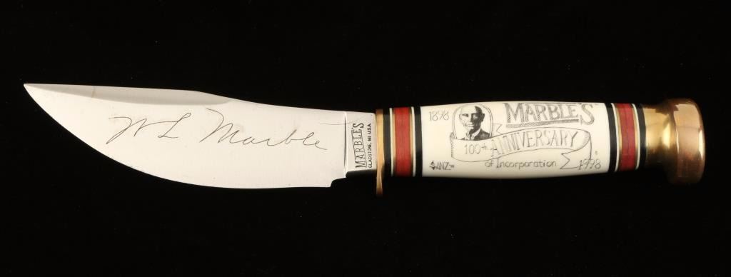 With scrimshawed handle that has a likeness of W.L. Marble and "1898 Marble's 100th Anniversary of Incorporation 1998" and "Sanz '98". WL Marble signature etched in blade. Measures 9" overall with a 5" blade. In wooden box.