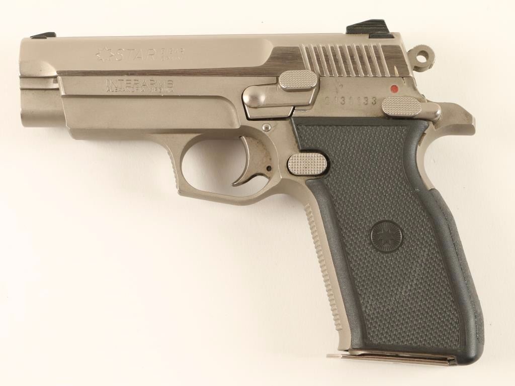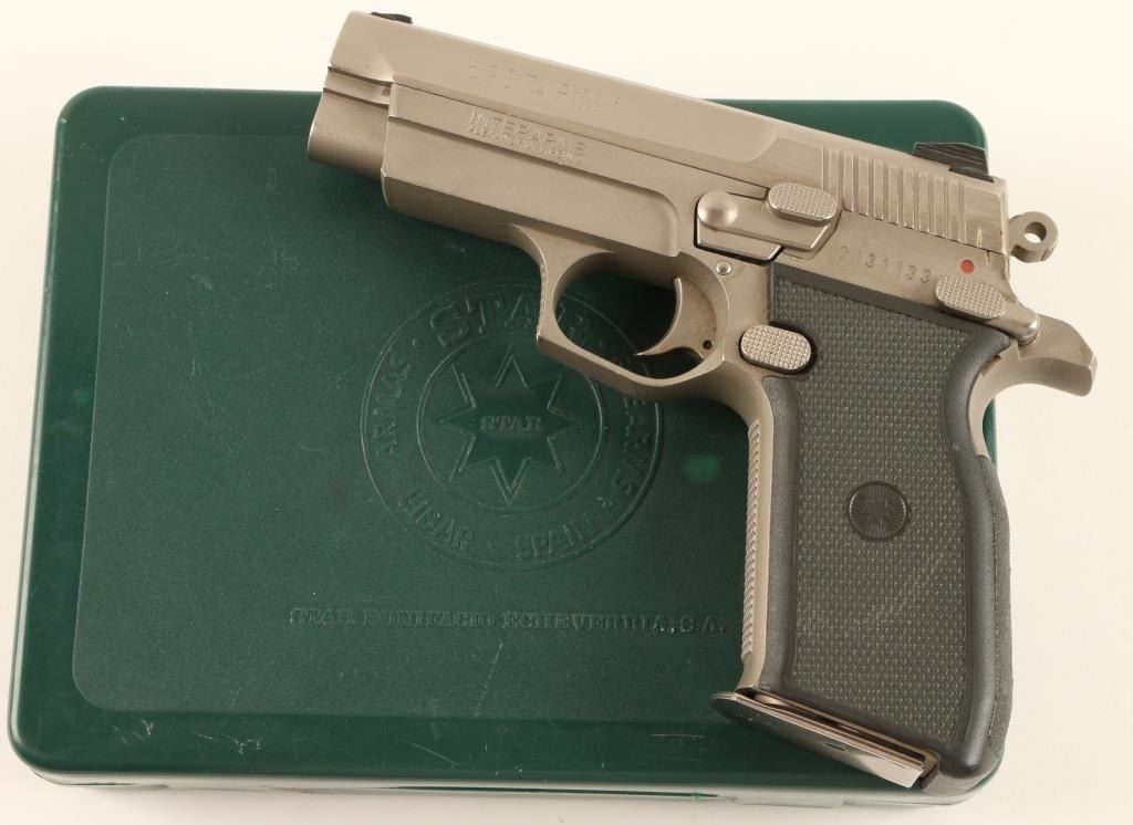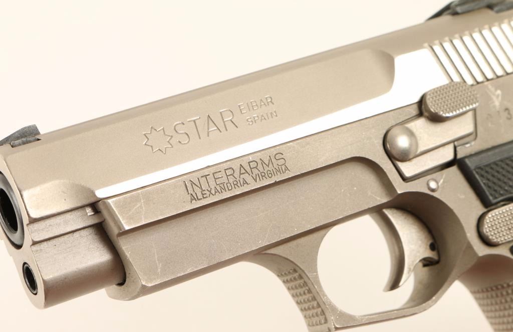 Spanish made compact single action pistol chambered in 9 x 19mm, manufactured by Star. Features a brushed chrome finish, 3.4" barrel, adjustable three dot sight system, ambidextrous safety, serrated round hammer, 13 round magazine and black checkered synthetic grips. Includes the original factory hard case with cleaning rod, brush, bore mop and documents. Finish shows only light handing wear with only minor superficial scuffs and scratches. Action is strong, bore is pristine and grips are fine. Condition is excellent in box. ***Modern Firearm***