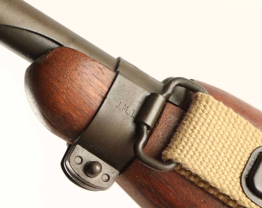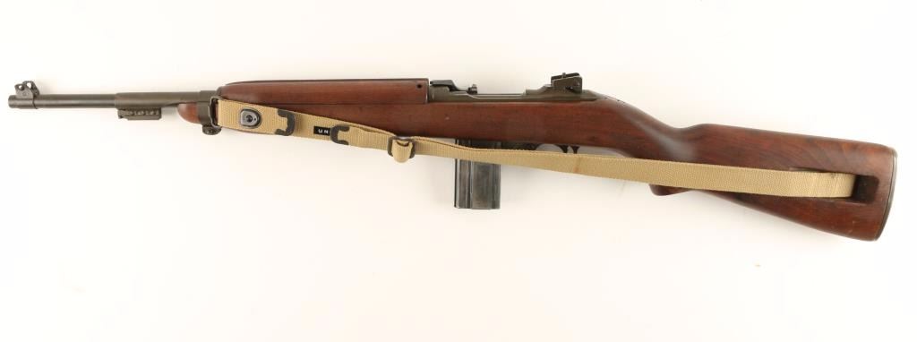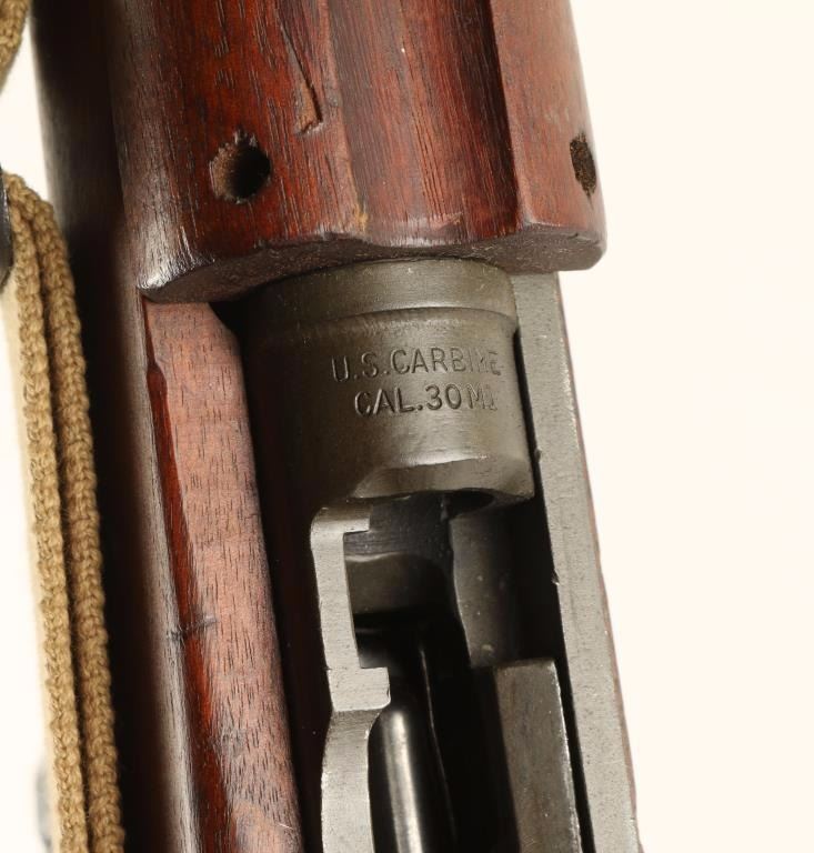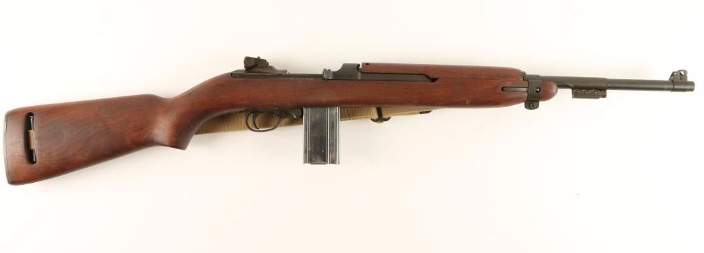 Rebuilt U.S. Military contracted semi-automatic rifle chambered in .30 Carbine, circa 1942. Features a parkerized finish, 18" Underwood barrel dated 1-43, winged front sight, adjustable rear aperture sight, wide barrel band with bayonet lug, canvas sling, low-wood handguard with narrow groove, oval cut oiler slot, rotary style safety, 15 round magazine, smooth trigger, flat bolt, and wood shoulder stock with circled "P" and "G.H.D./U.E.F.(Crossed Cannons)" cartouche. Rifle retains 85% parkerized finish with light even wear. Action is smooth, bore is pristine, and wood stocks are fine with few blemishes. Condition is excellent as vintage. ***C&R Firearm*** ***Modern Firearm***