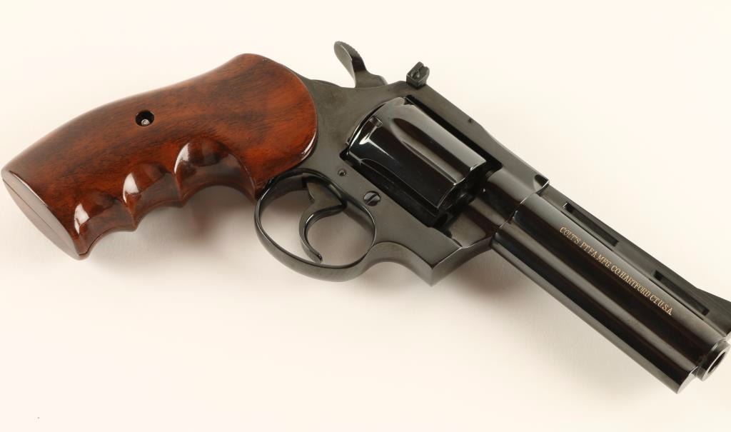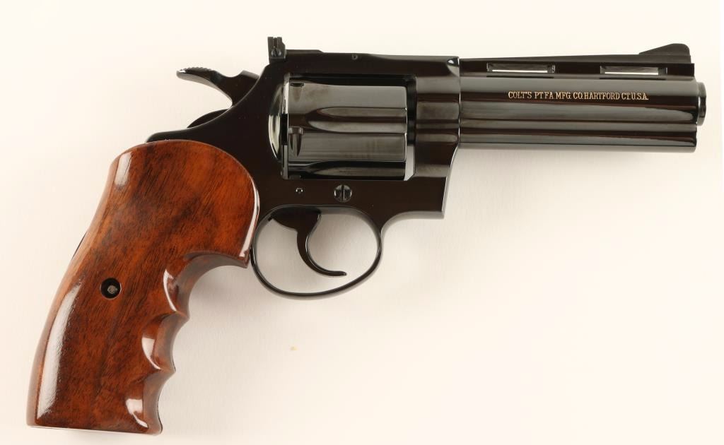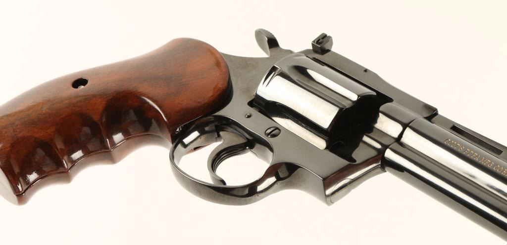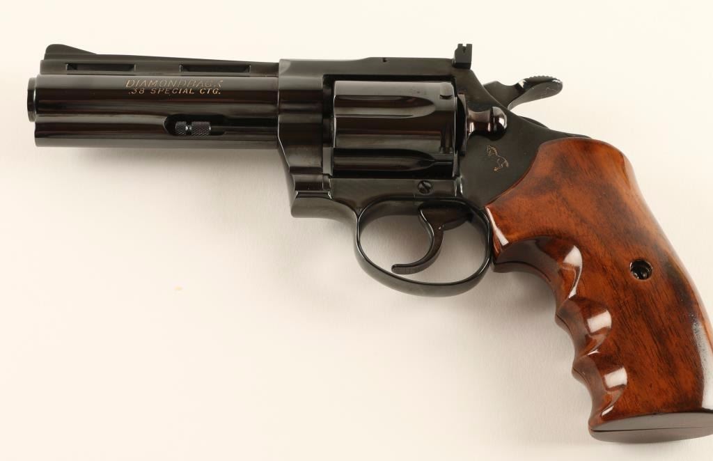 Desirable medium frame double action revolver chambered in .38 Special, circa 1969. Features a fully blued high polish finish, 4" ventilation ribbed barrel with full underlug, ramped front sight, adjustable rear window sight, fluted six shot cylinder, serrated wide hammer spur & trigger, and two piece smooth hardwood grips with finger grooves. Revolver retains 96% original bright finish with few minor losses on crane and frame which resembles pitting under the finish. Action is smooth, bore is good with super light pitting inside/surface rust, and good grips are fine. Condition is very good. ***Modern Firearm***