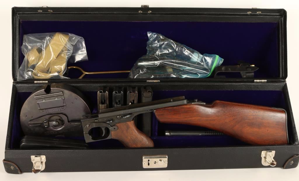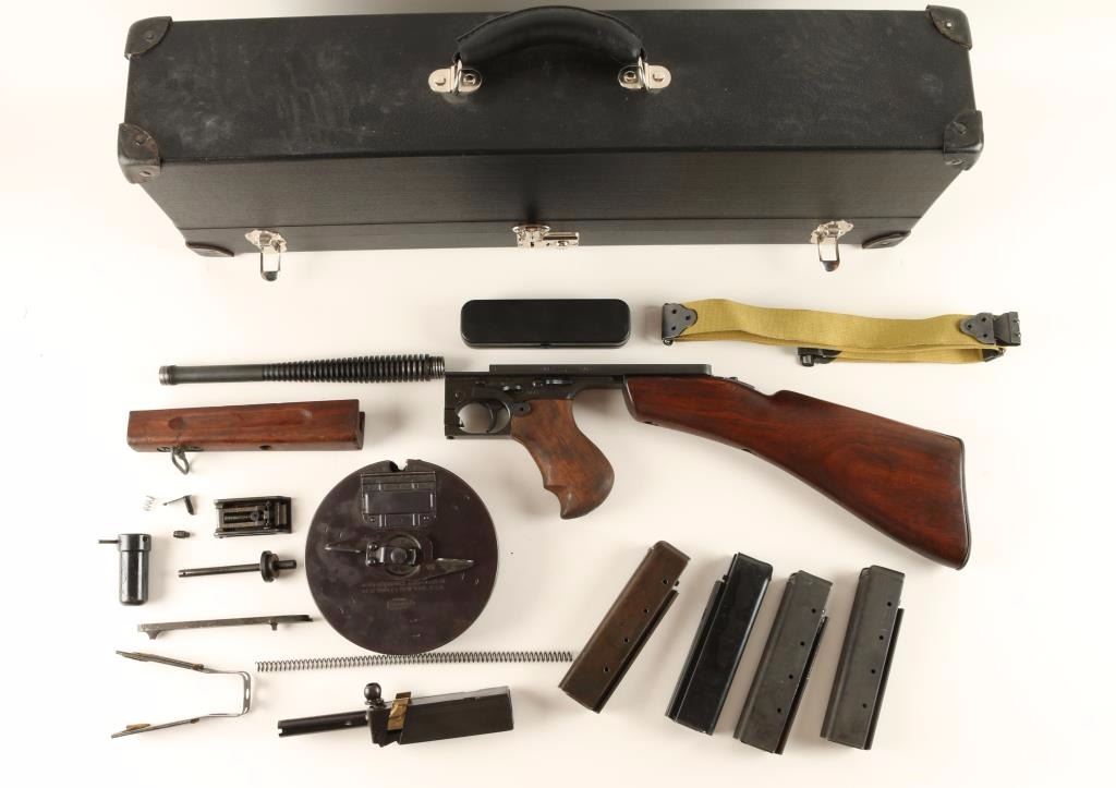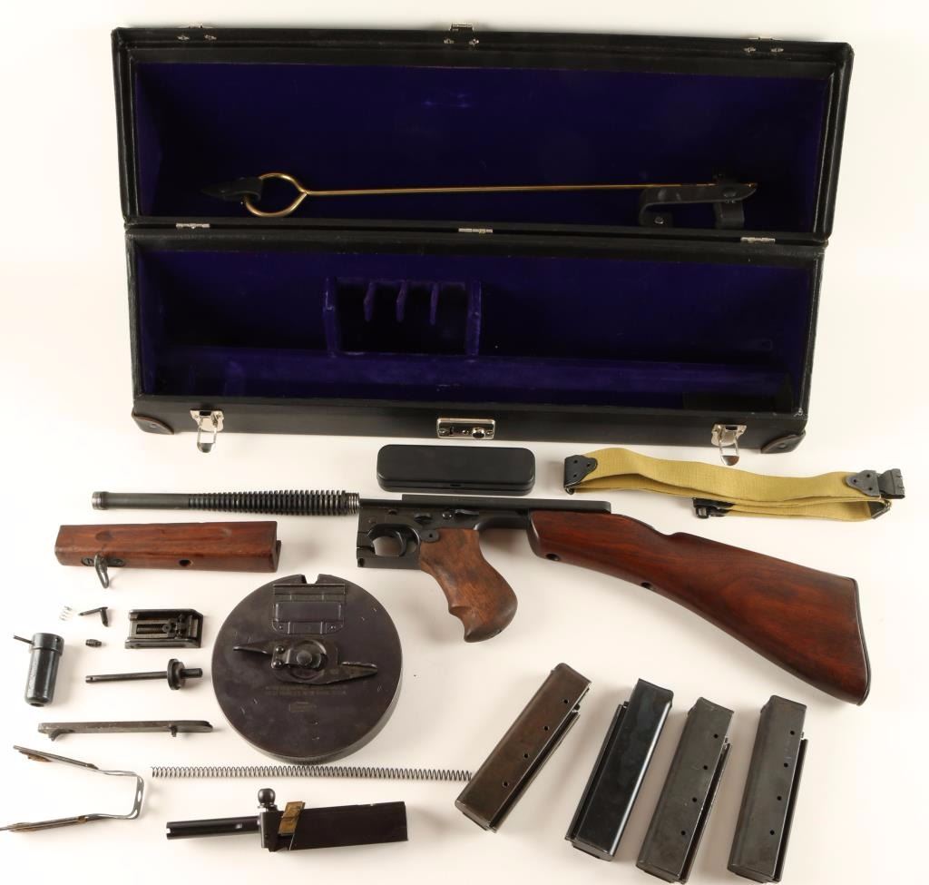 Finned Barrel with Thompson Cutts Compensator Lyman Sight Cleaning Kit Select Fire Trigger Group/Lower Receiver Complete Furniture Set (Detachable Walnut Buttstock, Butt Plate, Sling mounts, Walnut Pistol Grip and Forend) Bolt/ Actuator, Complete with Firing Pin, Extractor, Hammer and bras H piece. 1 Brass Cleaning Rod Green Canvas Sling Auto-Ord Thompson 50rd L drum mag 4 Stick Mags A velvet lined FBI Case Bolt & Recoil Spring Guide & Buffer Forearm Arm Receiver Oiler Pad Frame