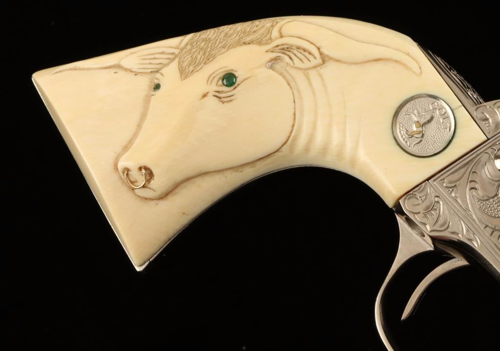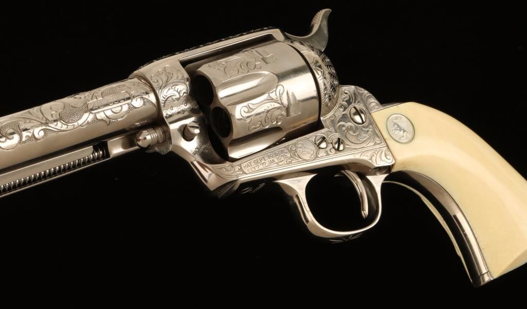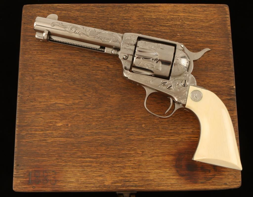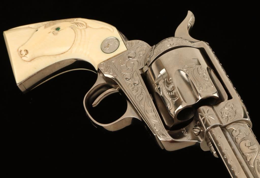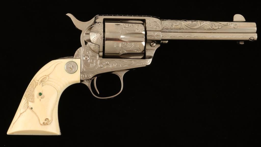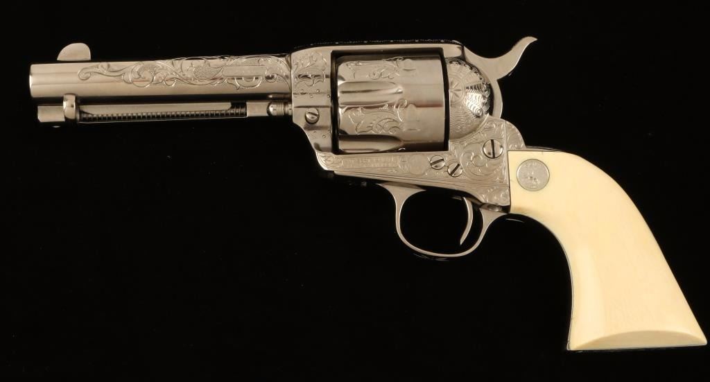 Masterfully restored & engraved first-generation single action revolver chambered in .45 Colt, circa 1905. Features a nickel plated finish, fine scroll engraving, 4 3/4" barrel with two line address, blade front sight, notched rear sight, fluted six-shot cylinder, ejector rod, checkered hammer spur, and Colt medallion carved steer head ivory grips. Includes a custom fitted presentation case with branded Colt logo on lid. Finish shows only light handling wear. Action is crisp, markings are sharp, bore is good with some light pitting, lockup is solid, and grips are extra fine. Condition is excellent as restored. ***Modern Firearm***