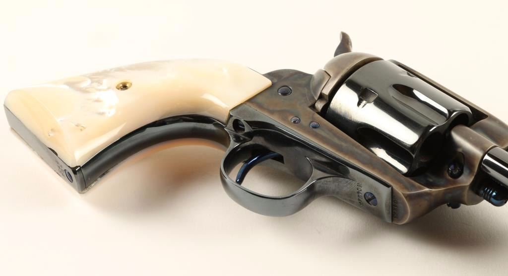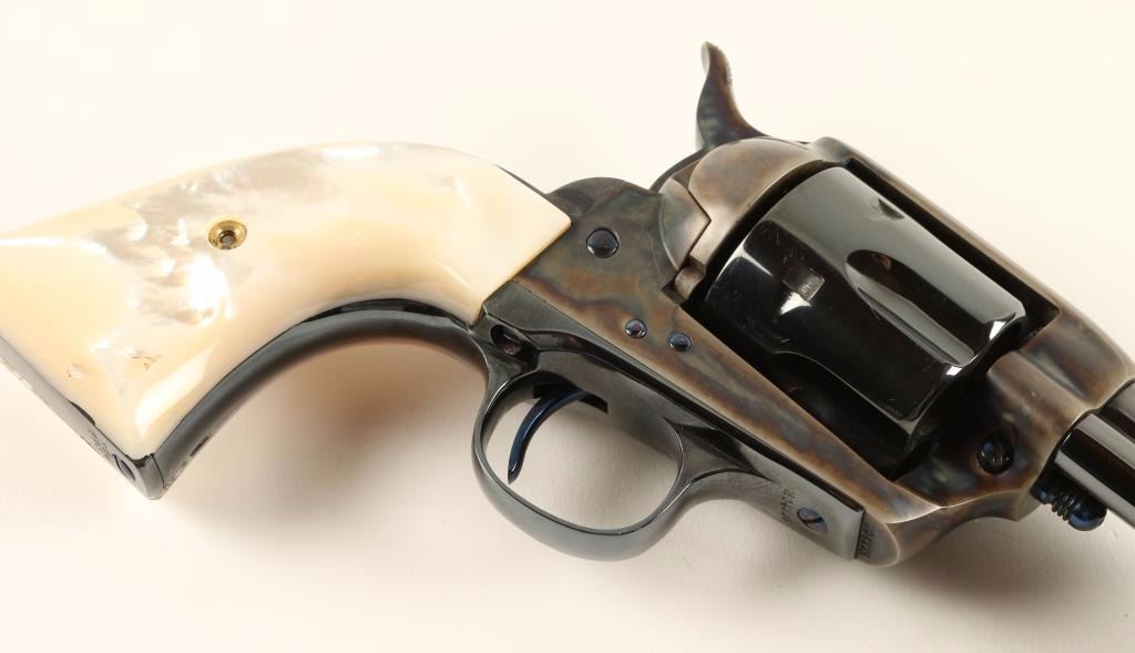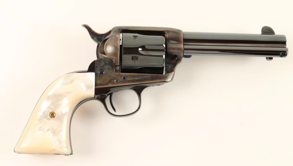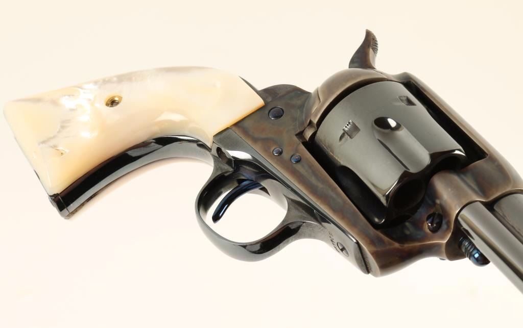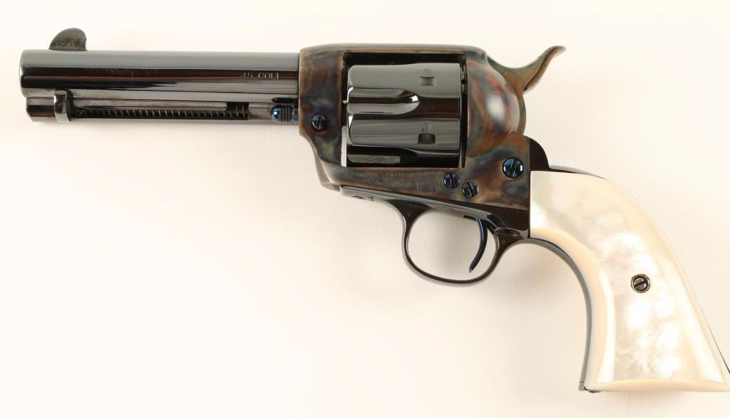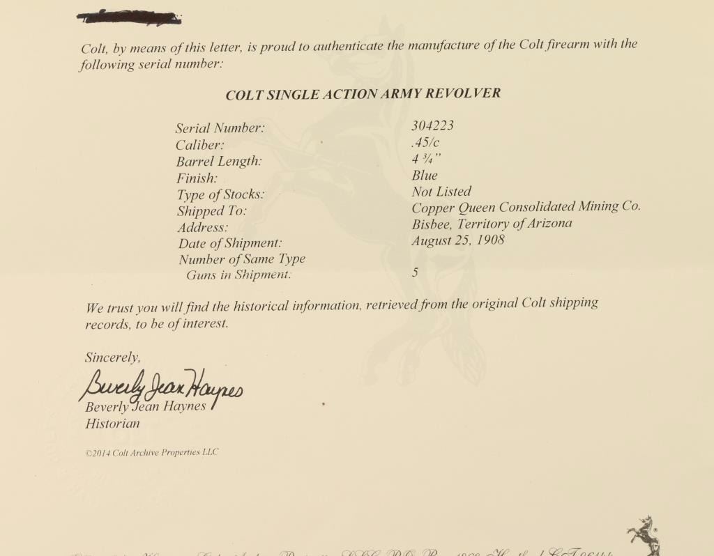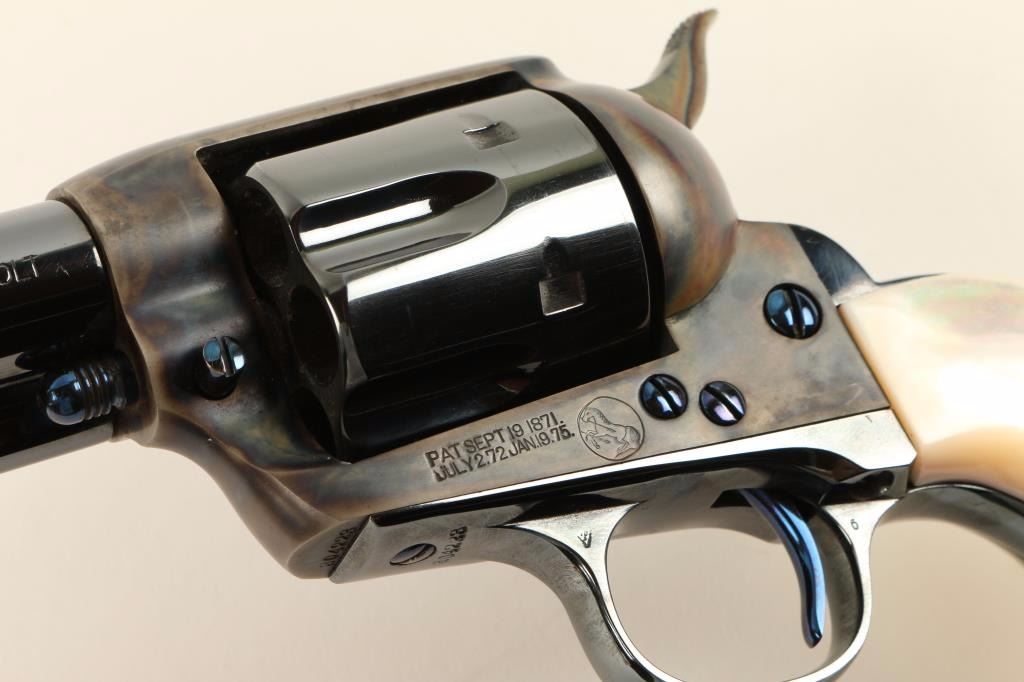 Beautifully refinished Arizona Territory shipped single action revolver chambered in 45 Colt, circa 1908. Features a blued 4.75" barrel with two line address, ejector rod, blade front sight, v-notched rear sight, case hardened frame with push button cylinder pin release, blued fluted cylinder, fire blue screws, case hardened hammer with checkered spur and gorgeous two piece mother of pearl grips. Includes a Colt factory letter stating it's original configuration and states it was shipped on August 25th, 1908 to Copper Queen Consolidated Mining Co. Bisbee, Territory of Arizona in a five gun shipment. Finish is bright with rich colors showing only slight handling wear and a very faint drag line. Matching serial numbers on frame, trigger guard and backstrap. Markings are crisp. Action is strong, bore is excellent and grips are very fine with a few natural flaws. Condition is excellent as expertly restored. ***C&R Firearm*** ***Modern Firearm***