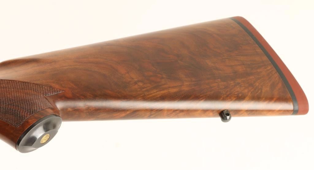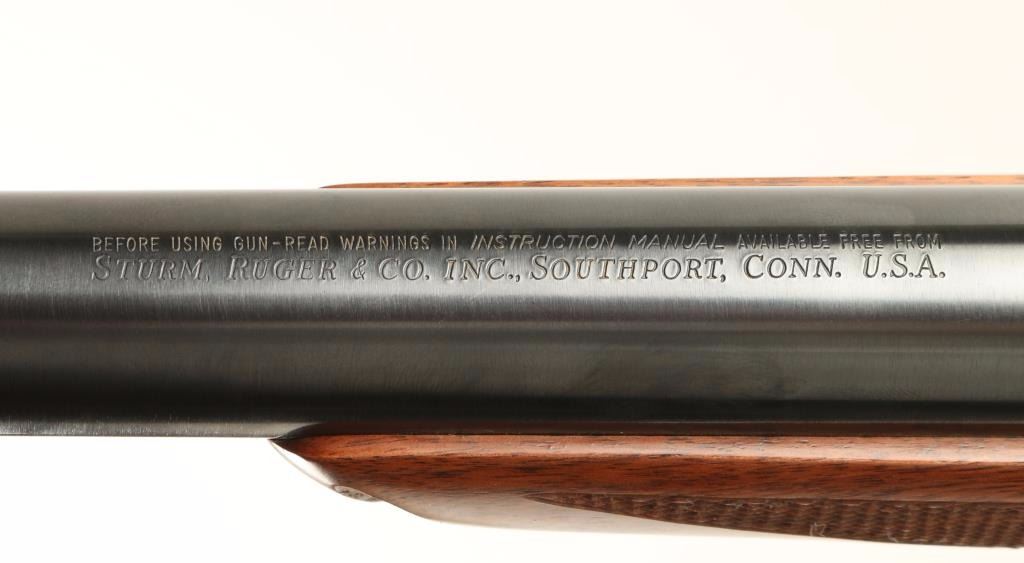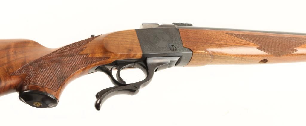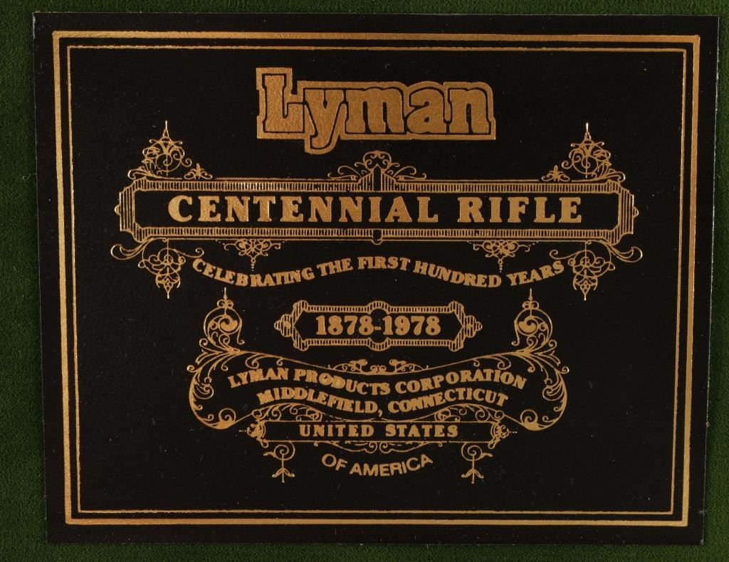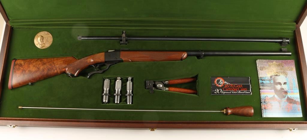Lyman Centennial Edition II presentation rifle with series number 78-0241. Includes green velvet lined walnut case with brass hardware that holds; the rifle, a Lyman century model scope with matching series number to rifle, three reloading dies, bullet mold, a box of 20 Lyman .45/70 nickel plated cartridge cases, a Durango Gun cleaning rod, a Ruger manual, a commemorative disc and a copy of the Lyman Centennial Journal. According to the Journal this is one of 101 deluxe cased versions of this rifle offered in 1978. The rifle is a blued falling block single-shot lever rifle with a 28" bull barrel with scope blocks, engraved receiver, adjustable trigger, checkered deluxe wood, sling studs, steel grip cap and factory recoil pad. the rifle is immaculate inside and out. Probably unfired. Condition is near perfect. *Modern Firearm*