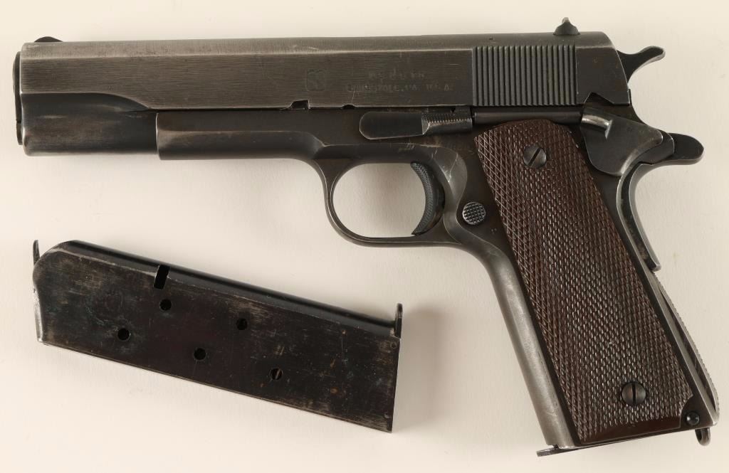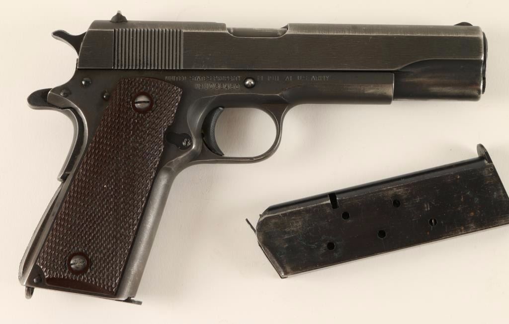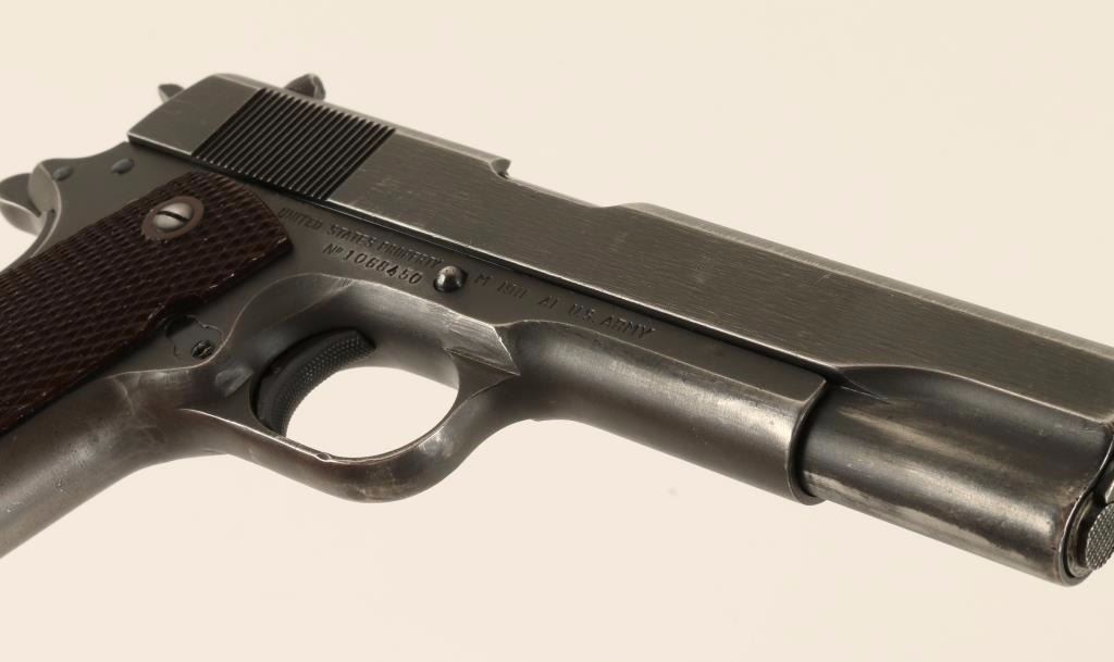 SN: 1068450 U.S. Military contracted semi-automatic service pistol chambered in .45 Automatic Colt Pistol, circa 1943. Features original finish, 5" High Standard barrel, serrated slide, low-profile front sight, adjustable rear sight, steel frame, checkered trigger & hammer spur, thumb safety switch, beavertail grip safety, push button magazine release, 7 round magazine, and two piece brown checkered plastic grips. Includes an extra magazine. Markings: Barrel - "HS" & "P" Slide U.S.&S. logo & "U.S. & S. Co. / Swissvale, PA. U.S.A." Frame - "United States Property M 1911 A1 U.S. Army / No 1068450", "P", & circled "R.C.D.". Pistol retains approximately 60% thin original finish with holster wear. Action is strong, bore is excellent, and plastic grips are fine. Condition is near excellent. ***C&R Firearm*** ***Modern Firearm***