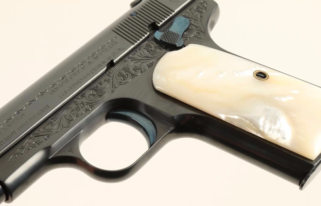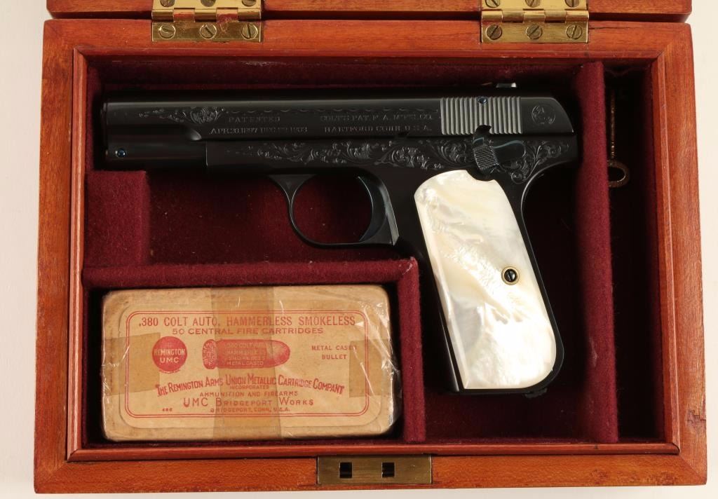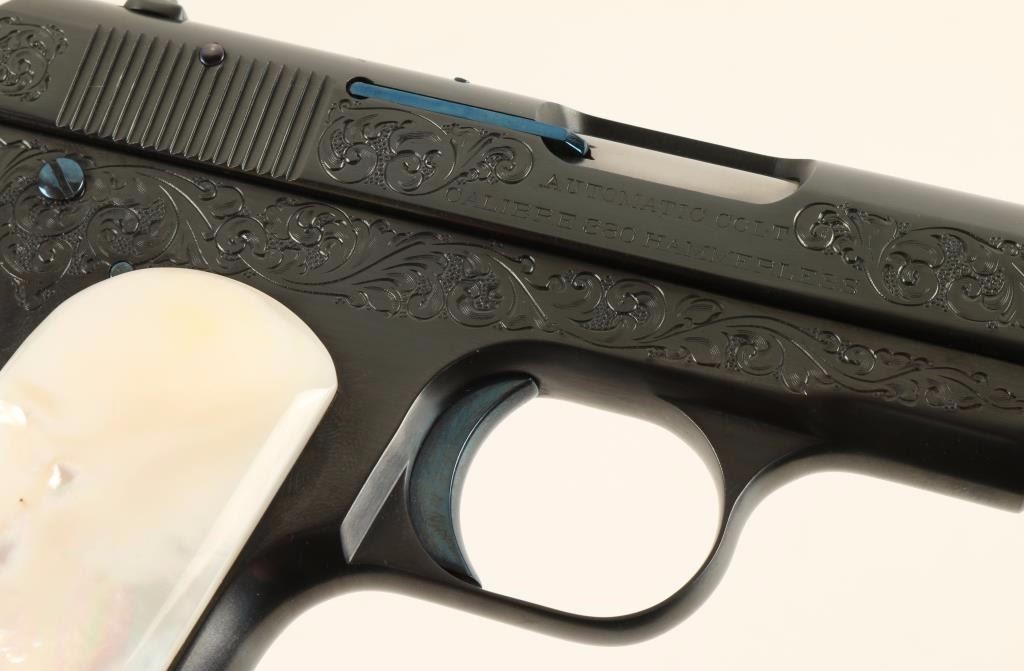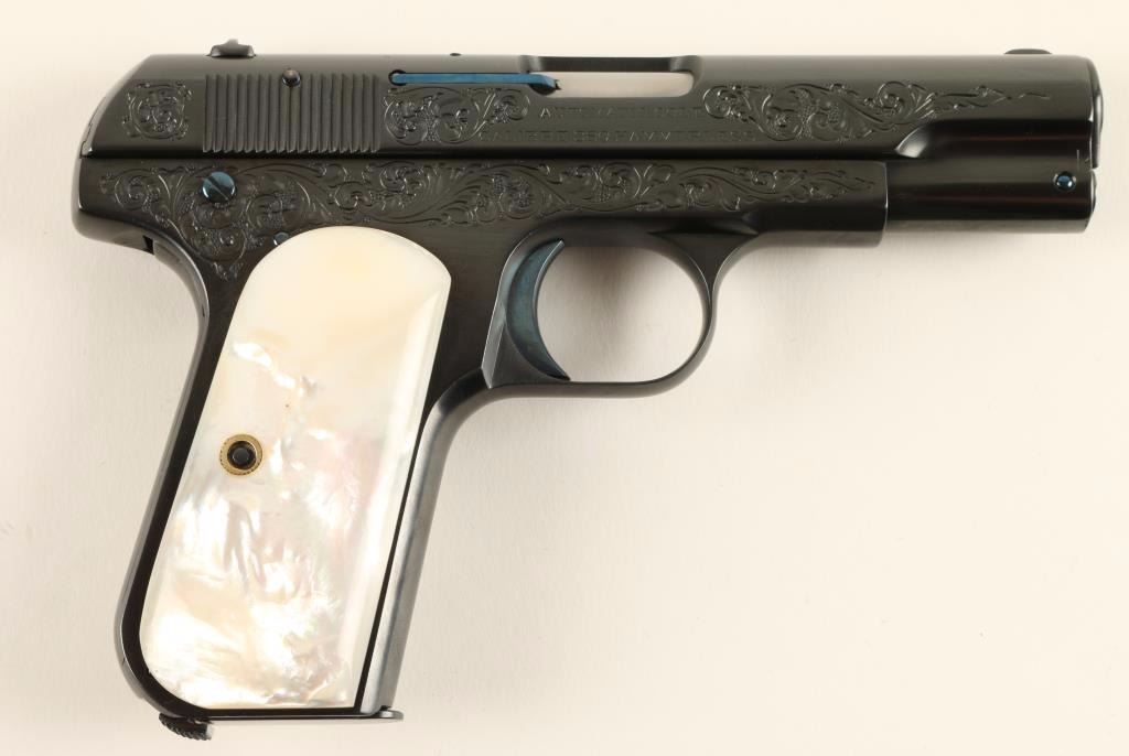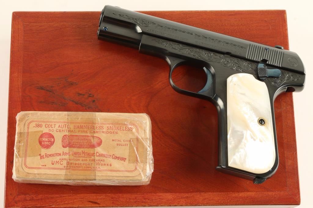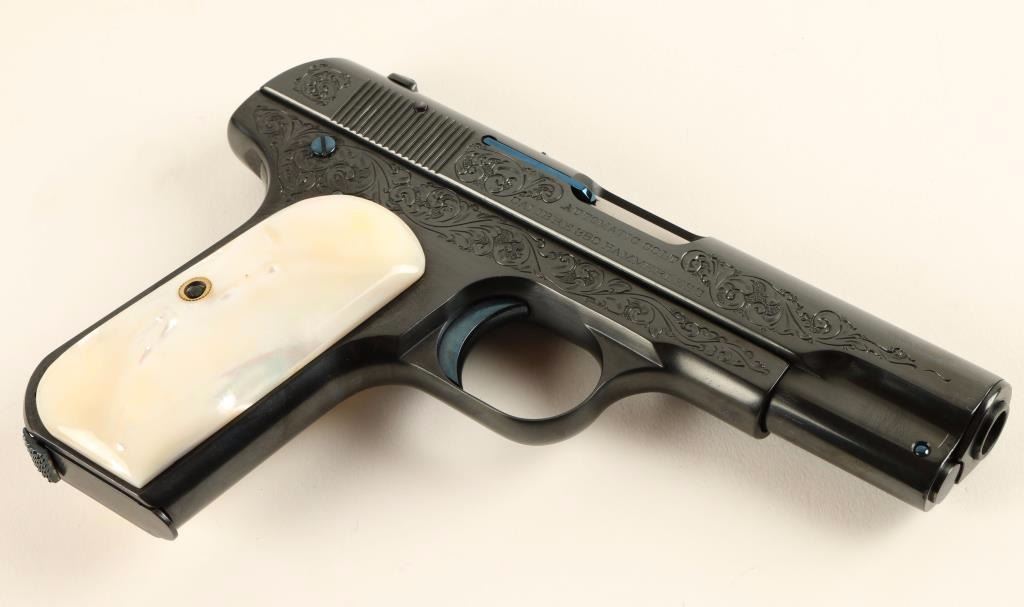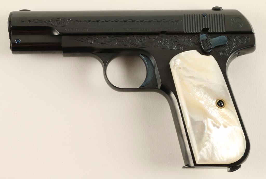 Beautifully restored and engraved concealed hammer semi-automatic pocket pistol chambered in .380 Automatic Colt Pistol, circa 1908. Features a royal blue finish with fire blue accents, 3.75" barrel, fine scroll engraving on slide & receiver, fixed sights, grip safety, 8 round magazine, and gorgeous mother of pearl grips. Includes a custom made compartmentalized locking wood case with maroon felt lining, key, and vintage box of Remington UMC cartridges. Finish shows a single spot of old pitting on the slide and is otherwise pristine. Action is smooth, bore is good, markings are crisp, and grips are extra fine. Condition is excellent as restored. ***C&R Firearm*** ***Modern Firearm***