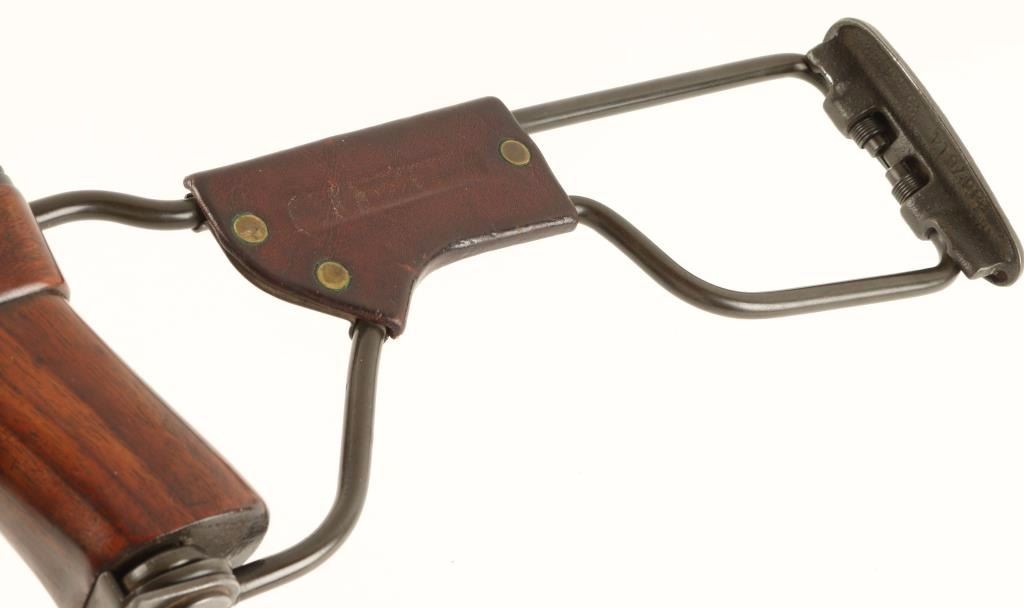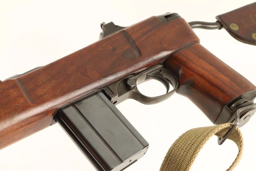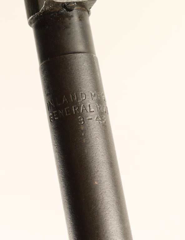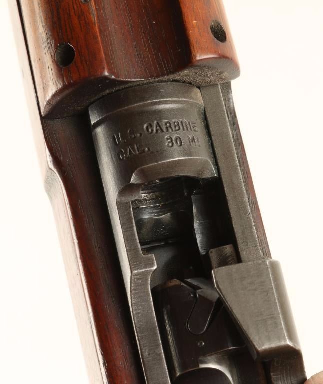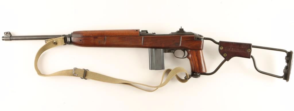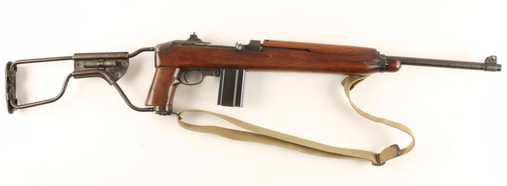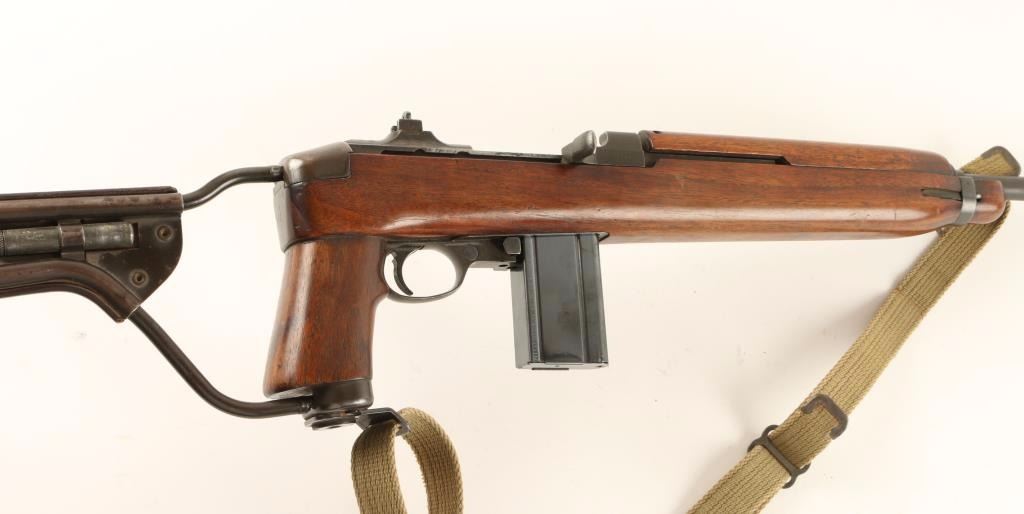 Blued semi-automatic Inland made U.S. military paratroopers carbine with a 18" barrel (stamped with "Inland MFG. DIV. General Motors 3-43"), no bayonet lug, web sling, one 15-round magazine, pistol grip stock, folding wire frame butt stock with oiler, early push button safety and early 2 position flip up rear sight with a leaf and a peep. Metal finish has edge wear, fading and few freckles of surface rust. Bore is shiny with good rifling. Action is very smooth and works well. Wood has dings from the buttplate when the stock is folded, rubs and scratches but no chips or cracks. Leather "cheek piece" is dark with green verdigris around the brass hardware. Condition is very good to excellent. *Modern Firearm*